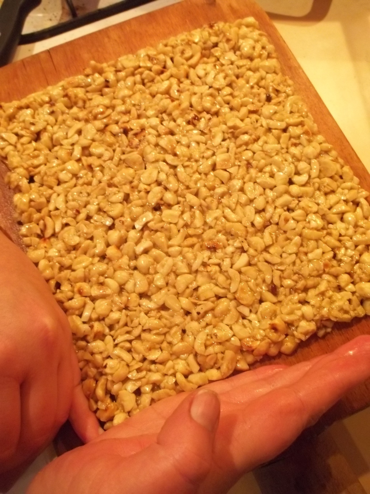 Gozinaki (Georgian: გოზინაყი) is a traditional Georgian confection made of caramelized nuts fried in honey and usually eaten on New Year’s Eve and Christmas. In this recipe we show how to make gozinaki with hazelnuts.