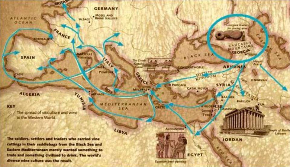 Map showing how the method of wine-making in Kvevri spread to Mesopotamia, Egypt, Greece and beyond.