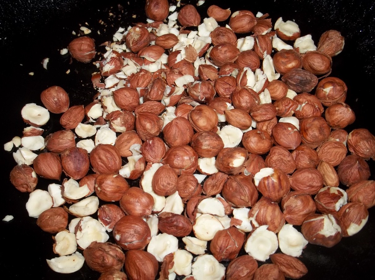 Shell the hazelnuts. Add to a hot pan and heat on a low-medium heat for 2-3 minutes. Stir continuously with a wooden spoon to loosen the skins. Remove from the heat and allow to cool a little. Remove the skins from the warm nuts with your fingers.