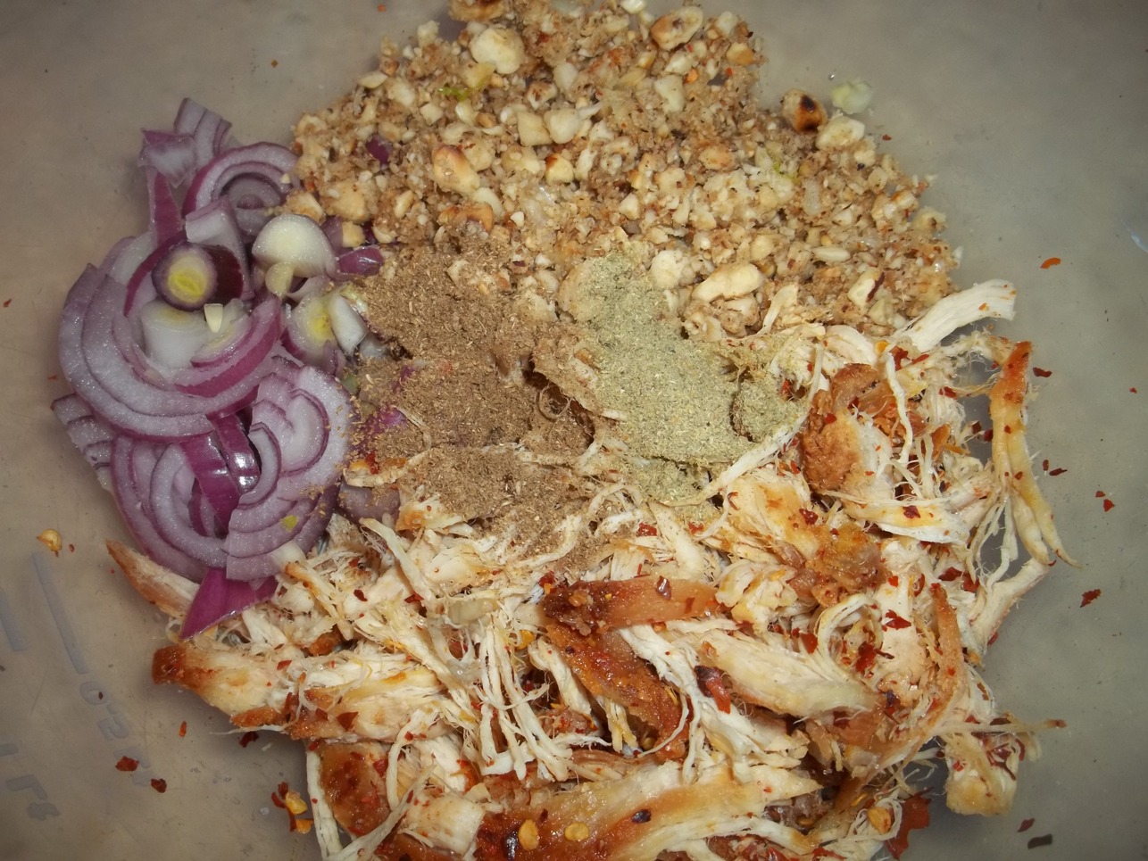 Shred the fried chicken with your fingers and add to a mixing bowl with 1 heaped tsp of coarse, hot red pepper and salt (amount dependent upon personal preference). Stir thoroughly.