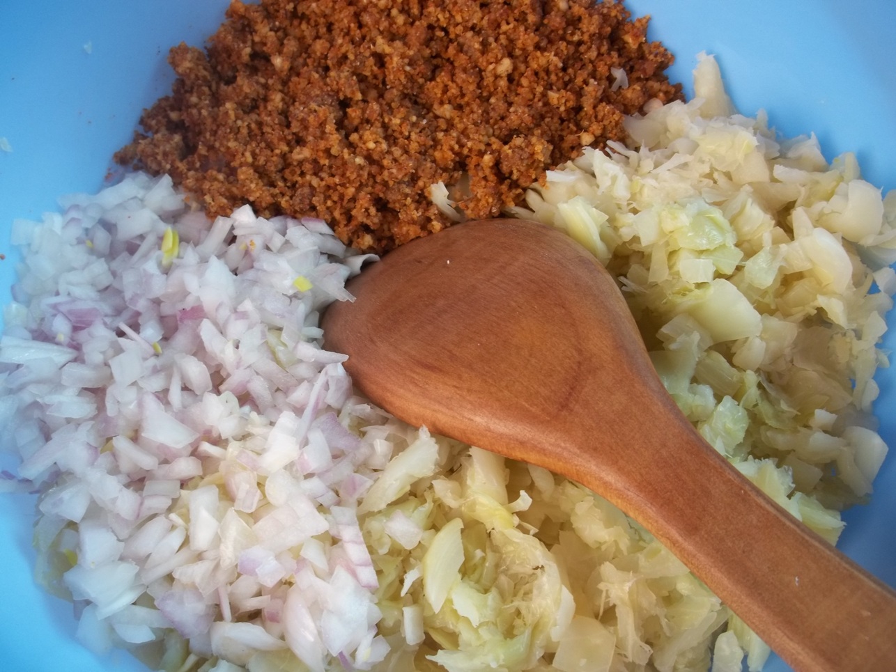 Chop the onion and add, together with the chopped cabbage, to the walnut/garlic/spice mixture.