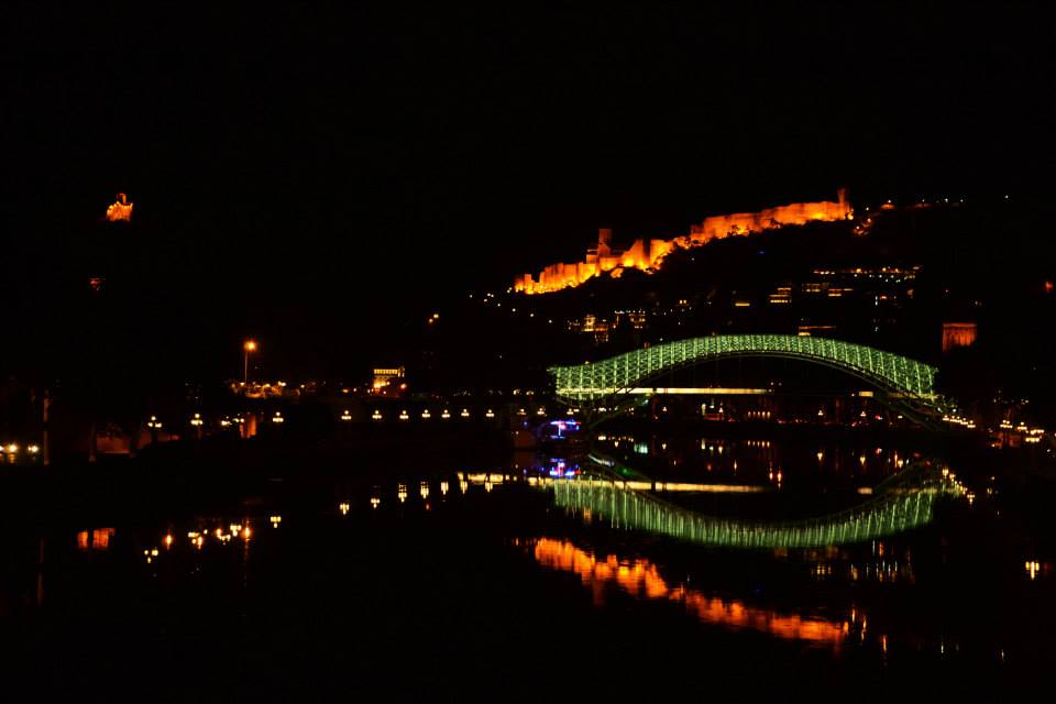 The fortress overlooks the bow shaped Bridge of Peace (Georgian: მშვიდობის ხიდი) pedestrian bridge that spans the Mtkvari River. The bridge is fitted with thousands of LED lights that are switched on 90 minutes before sunset, illuminating the river and the buildings on its banks.