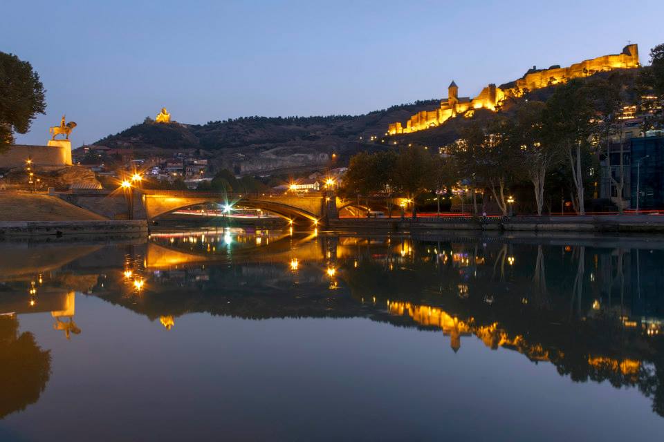 The Metekhi Church and the equestrian statue of King Vakhtang Gorgasali look out across the Mtkvari River towards the castle.