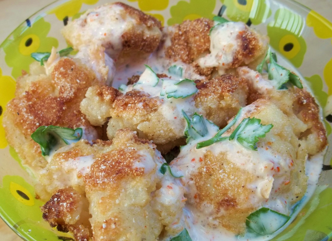 Ingredients: 1 medium sized cauliflower, 2 eggs, 150 grams of mayonnaise, 150 grams of sour cream, 10 cloves of garlic, 200 grams of fine cornmeal, 20 grams of fresh parsley, 1 tsp of dried coriander, 1 tsp of black pepper, 1 tsp of hot red pepper, 100 ml of oil, and salt (amount dependent upon personal preference).