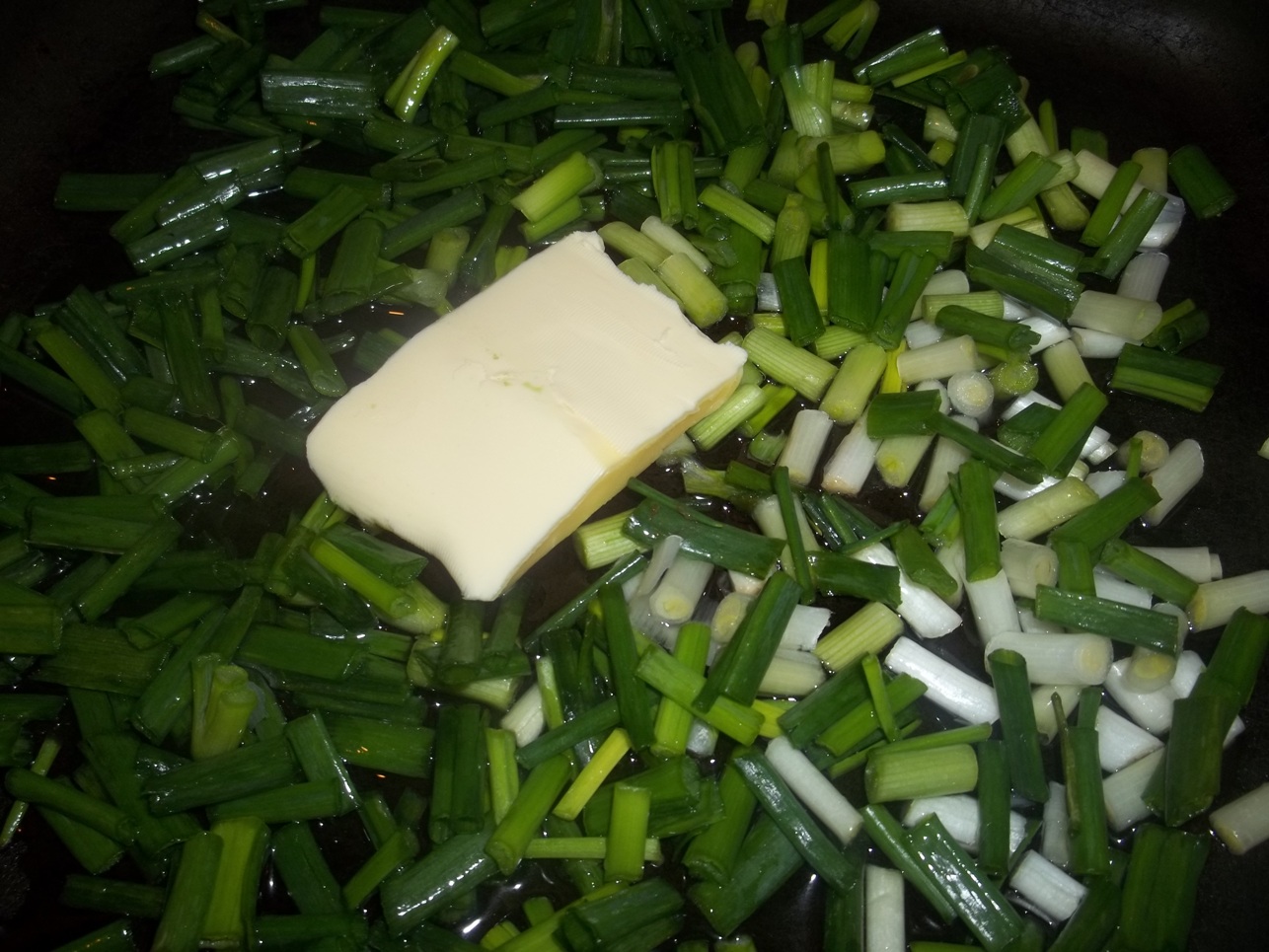 Chop the onions and add to a pan with 3 tbs of oil and 100 grams of butter. Fry on a low to medium heat for 2 minutes, stirring continuously.
