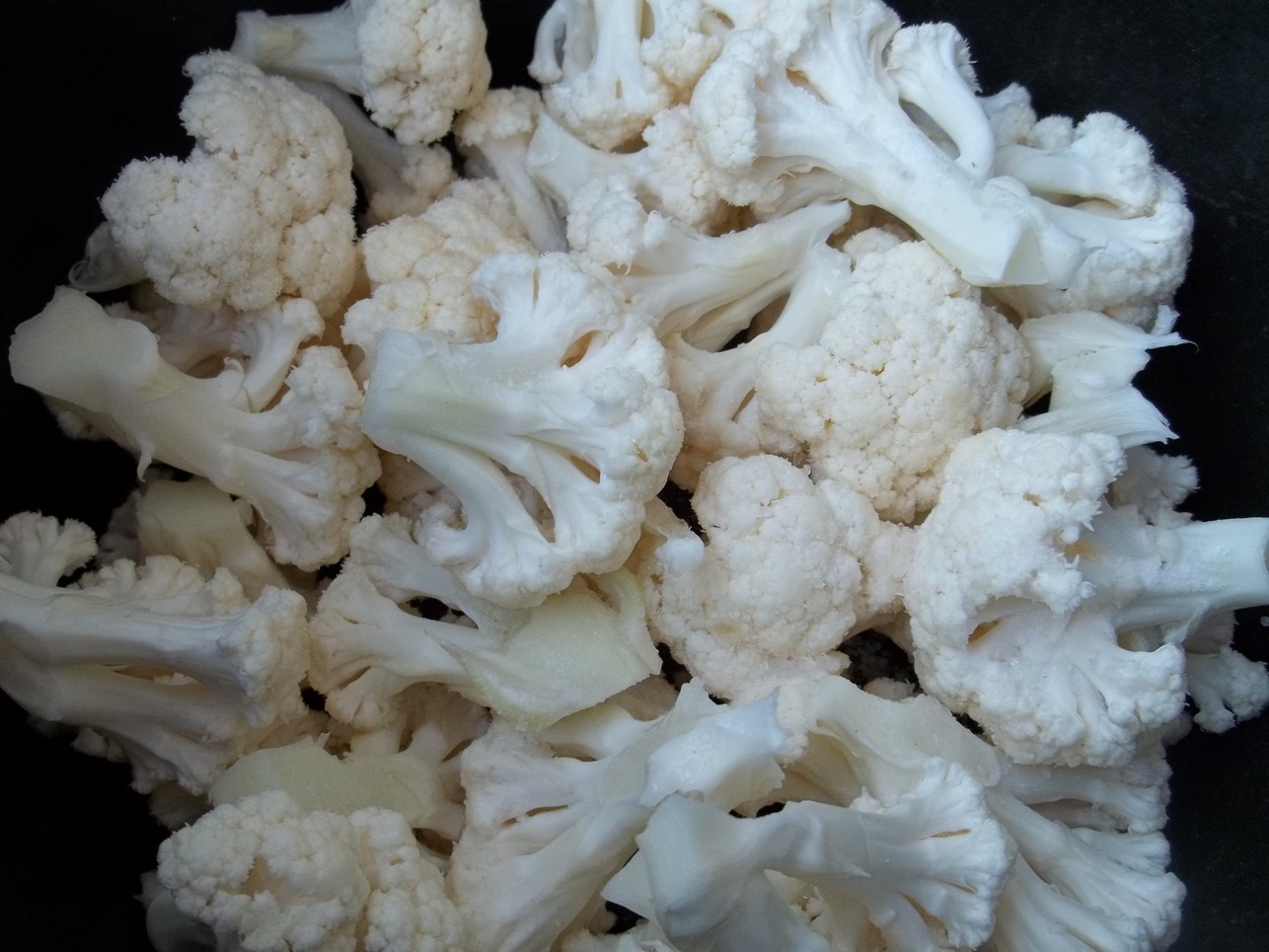 Wash and prepare the cauliflower. Add to a deep pot of salted water and boil for 20 minutes. Drain using a colander and add to the bowl containing the eggplant, peppers and onions.