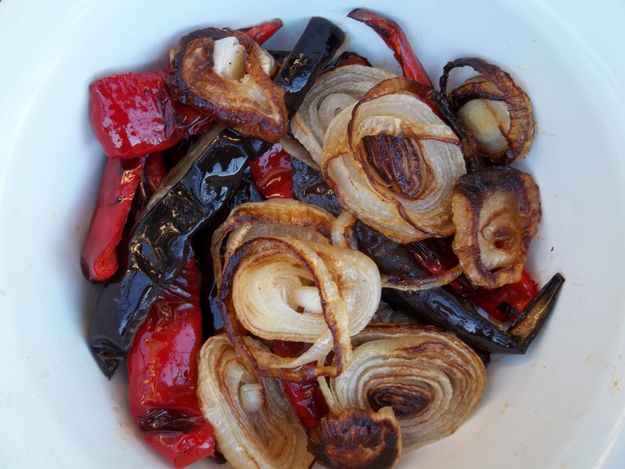 Preparation: Slice the eggplant, red pepper and onions and add to an oven dish with 6 tbs of oil. Cook on 180 C for 20 minutes.