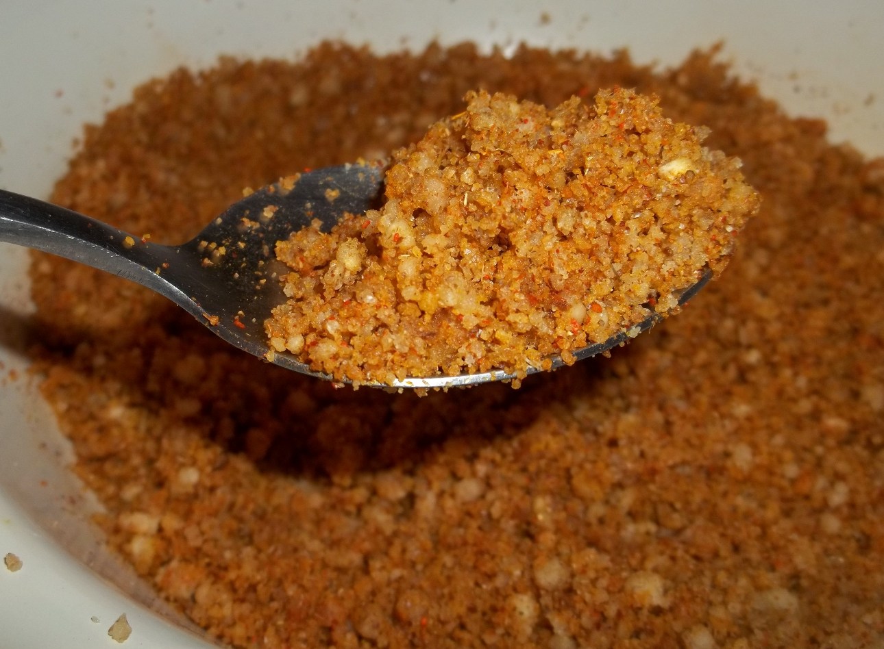 Grind the walnuts and garlic together (we used a meat grinder) and add to a mixing bowl. Add 1 tsp of dried blue fenugreek, 1 tsp of dried marigold, 1 tsp of dried coriander, 1 tsp dried hot red pepper, and salt (amount dependent upon personal preference)