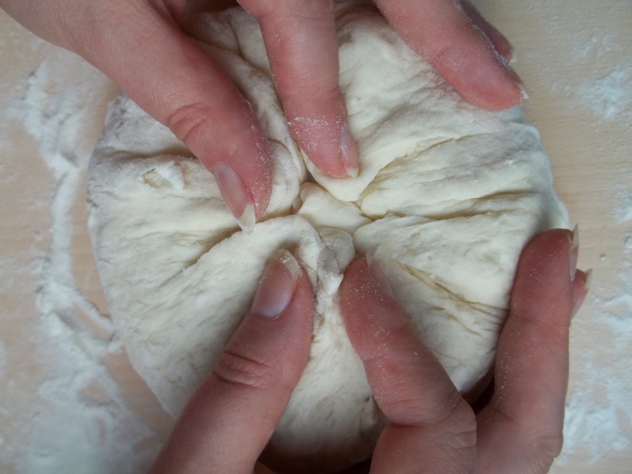 When you are ready to use the dough, add 150-200 grams of flour and knead the dough. The dough should be fluffy, not wet. Separate it into four same-size balls (only two are shown in the picture below).