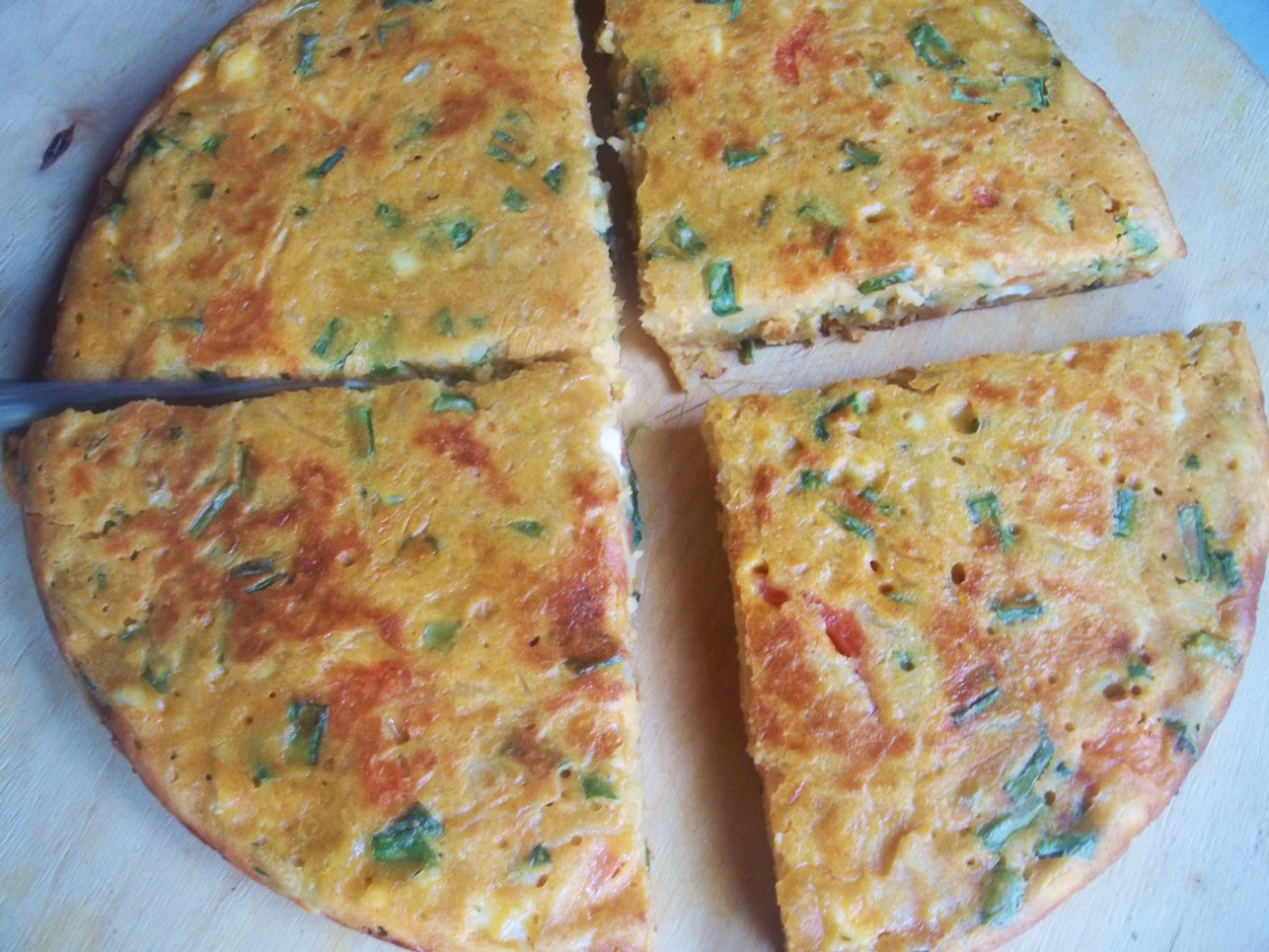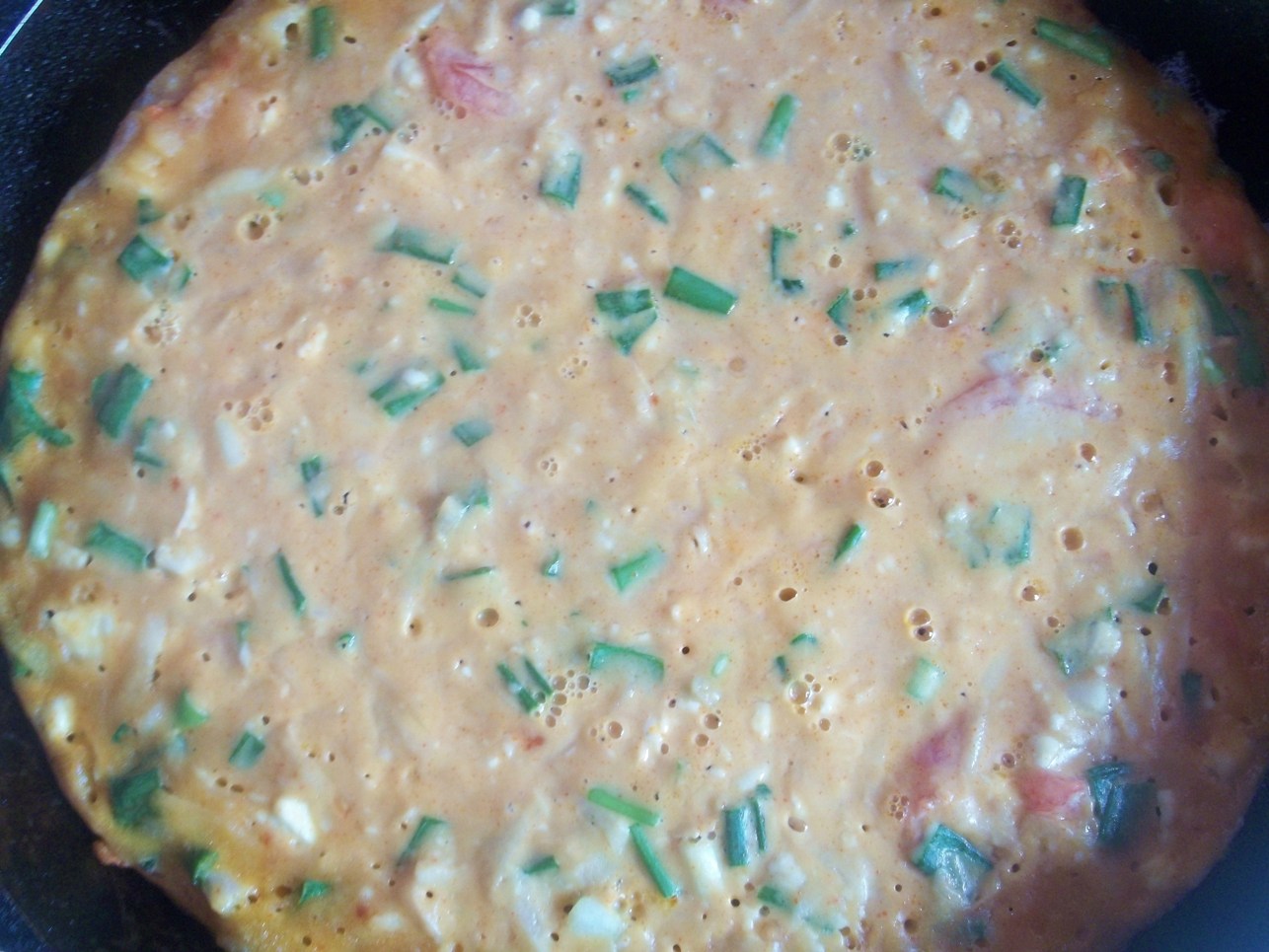 Add the cheese, green onions, grated potato and tomatoes to the egg/flour mixture and stir with a wooden spoon.