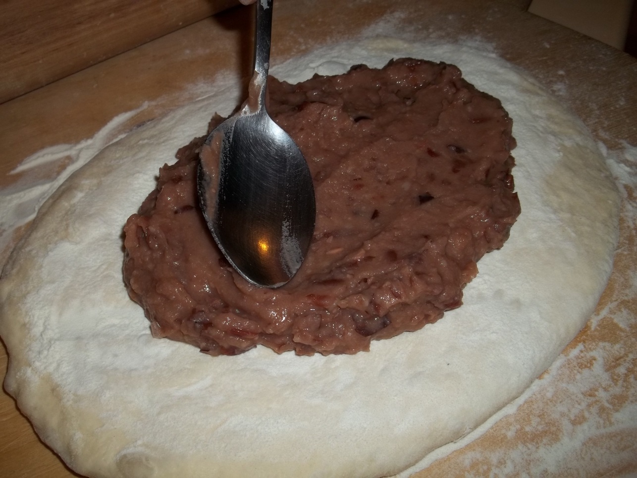 Spread a quarter of lobio filling onto the middle of each piece of dough.