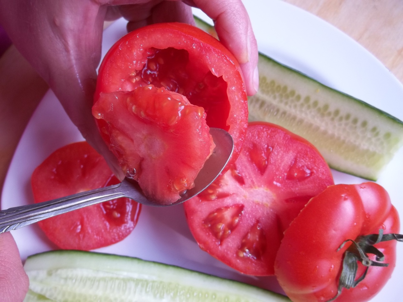 Use a spoon to remove the pulp from the tomatoes and put the pulp in the mixing bowl that will be used to make the side salad.