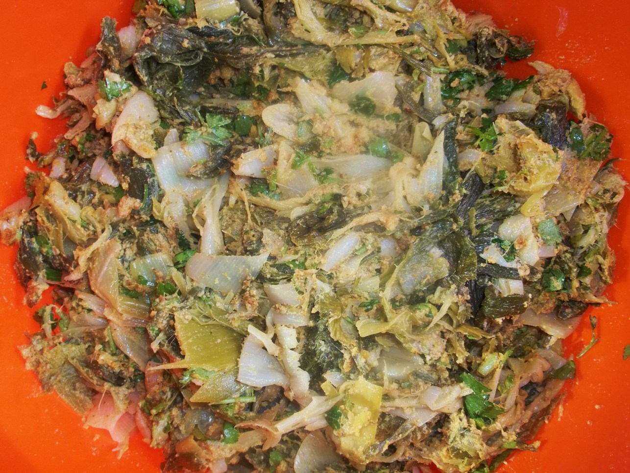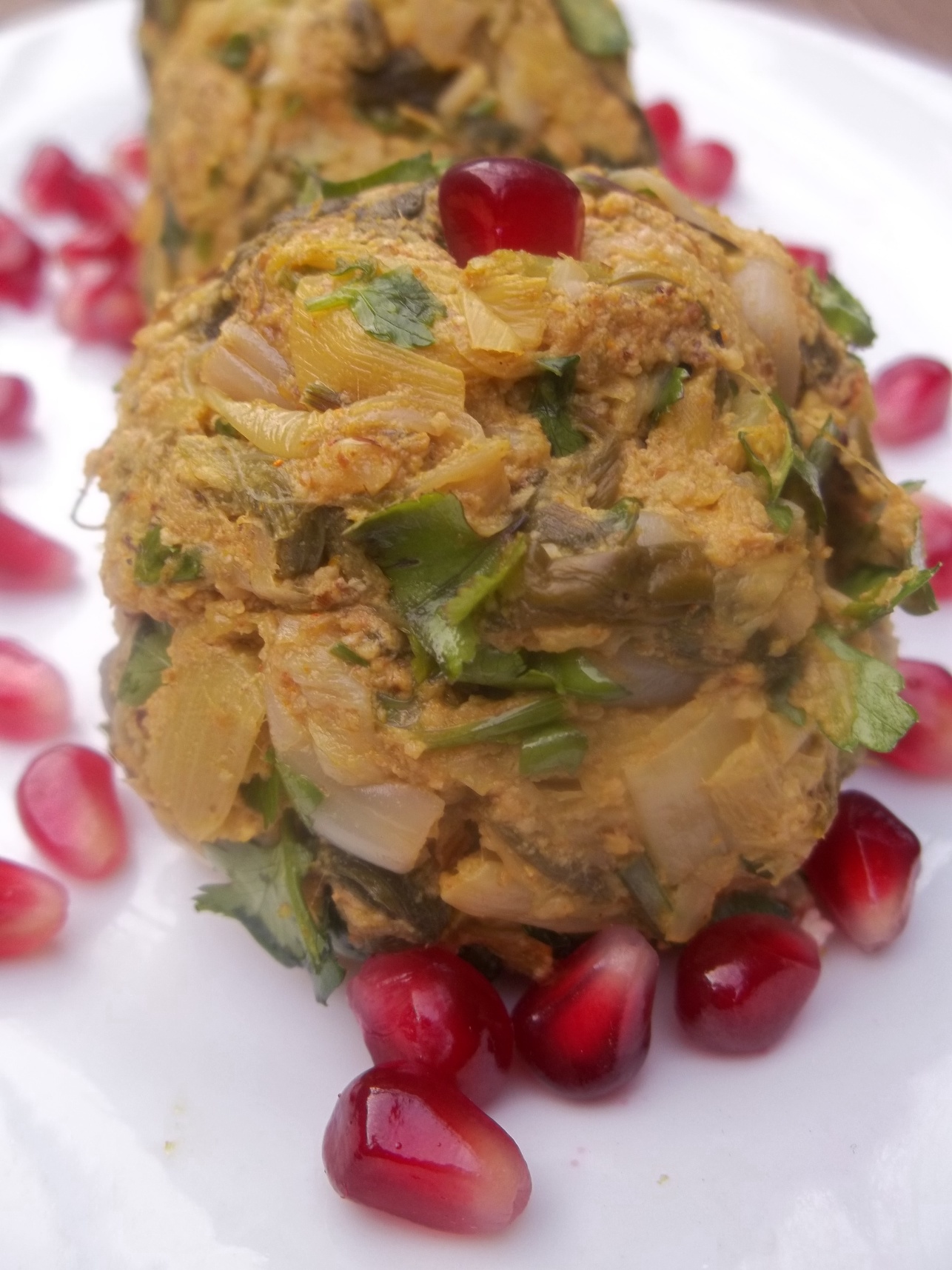 Ingredients: 1.5 kilos of leeks, 400 grams of walnuts, 30 grams of fresh parsley, 30 grams of fresh green coriander, 3 garlic cloves, 1 level tsp of blue fenugreek, 1 level tsp of dried marigold, 1 heaped tsp of dried hot red pepper (optional), 1 level tsp of dried coriander, 5 tbs of white wine vinegar, 2 tbs of vegetable oil, pomegranate seeds (for garnish), and salt (amount dependent upon personal preference).