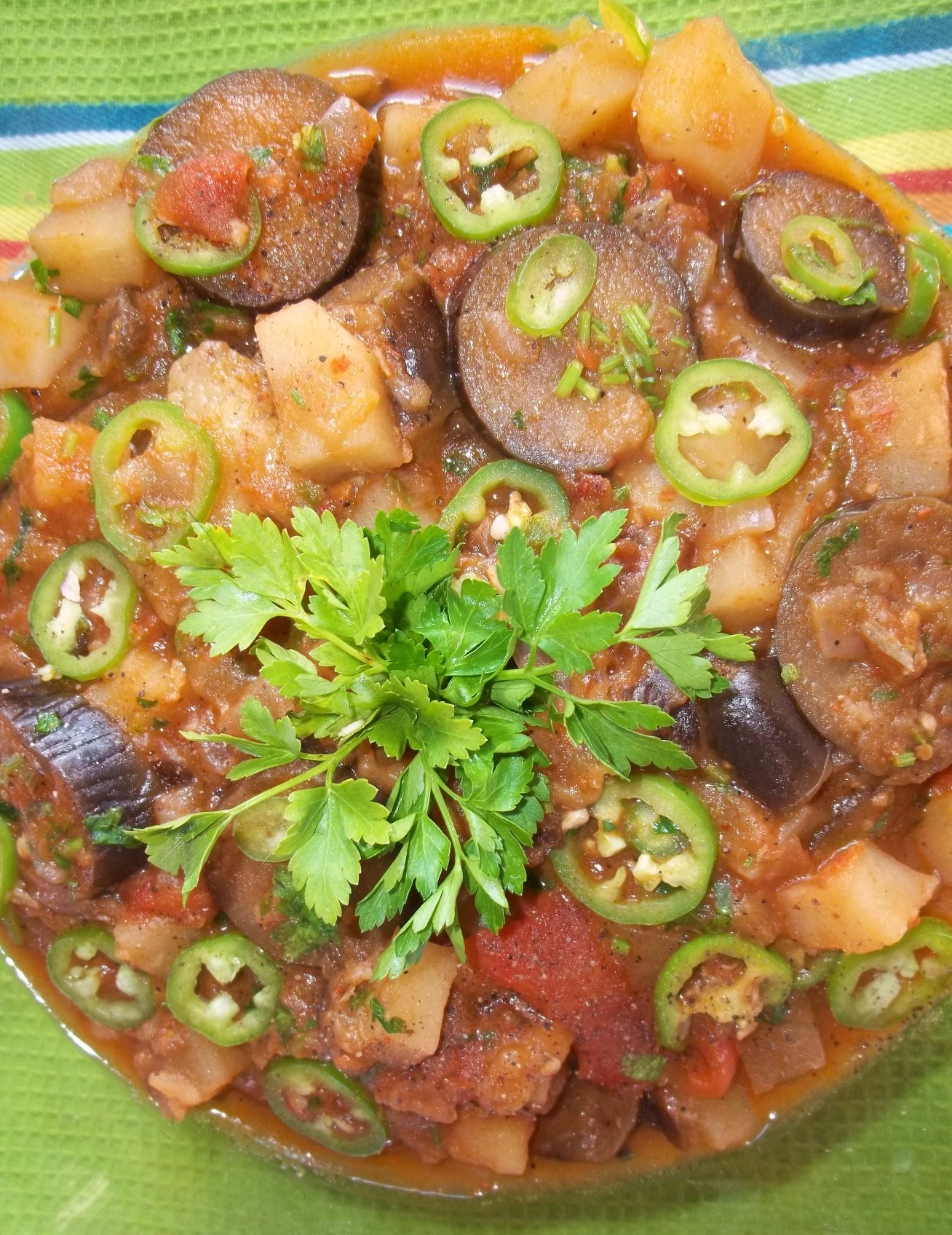 Ingredients: 600 grams of potatoes, 800 grams of eggplant (aubergine), 4 large juicy tomatoes, 3 large white onions, 2 hot green peppers, 30 grams fresh green coriander, 30 grams of fresh parsley, half tsp of black ground pepper, salt (amount dependent upon personal preference) and 7 tbs of oil.