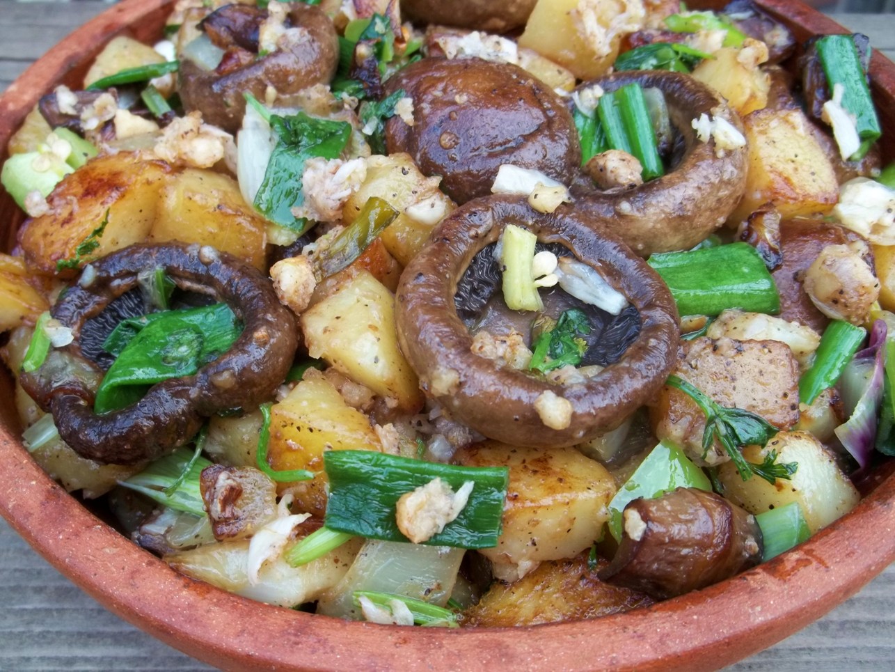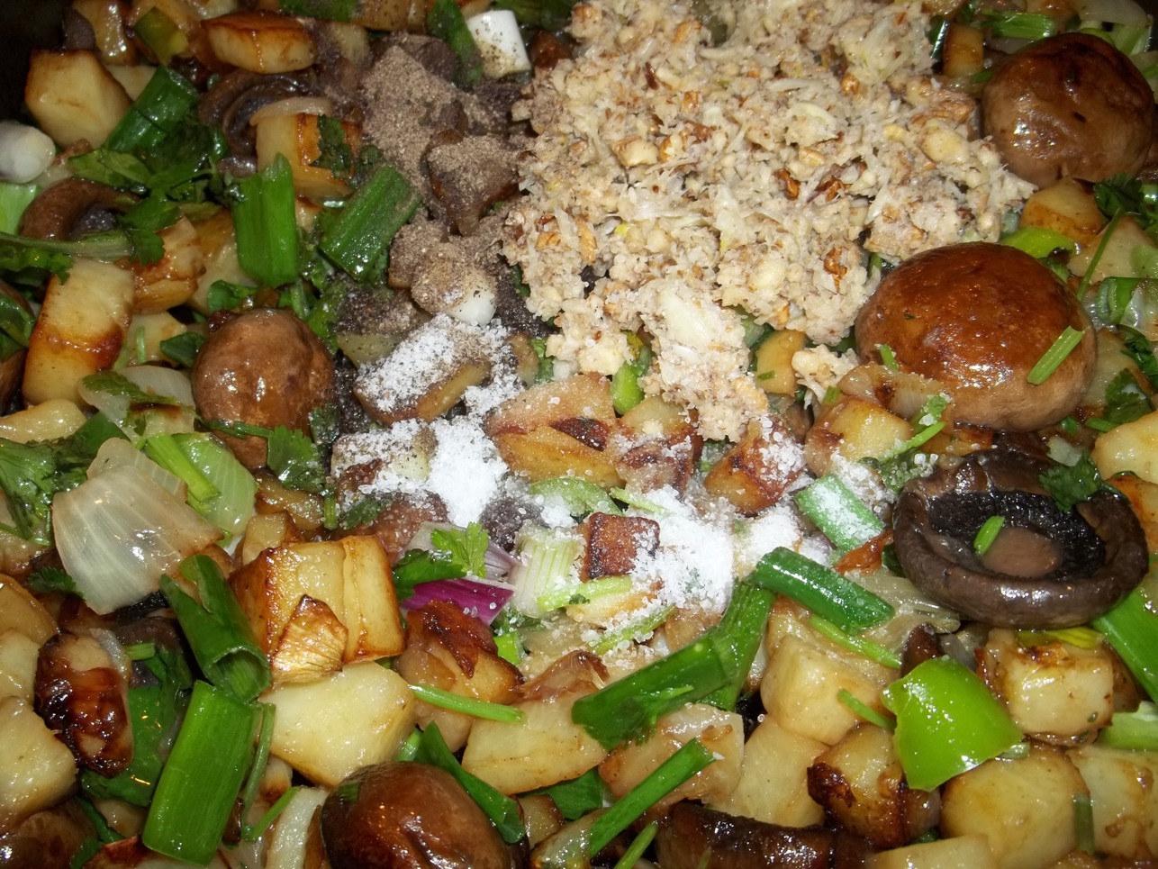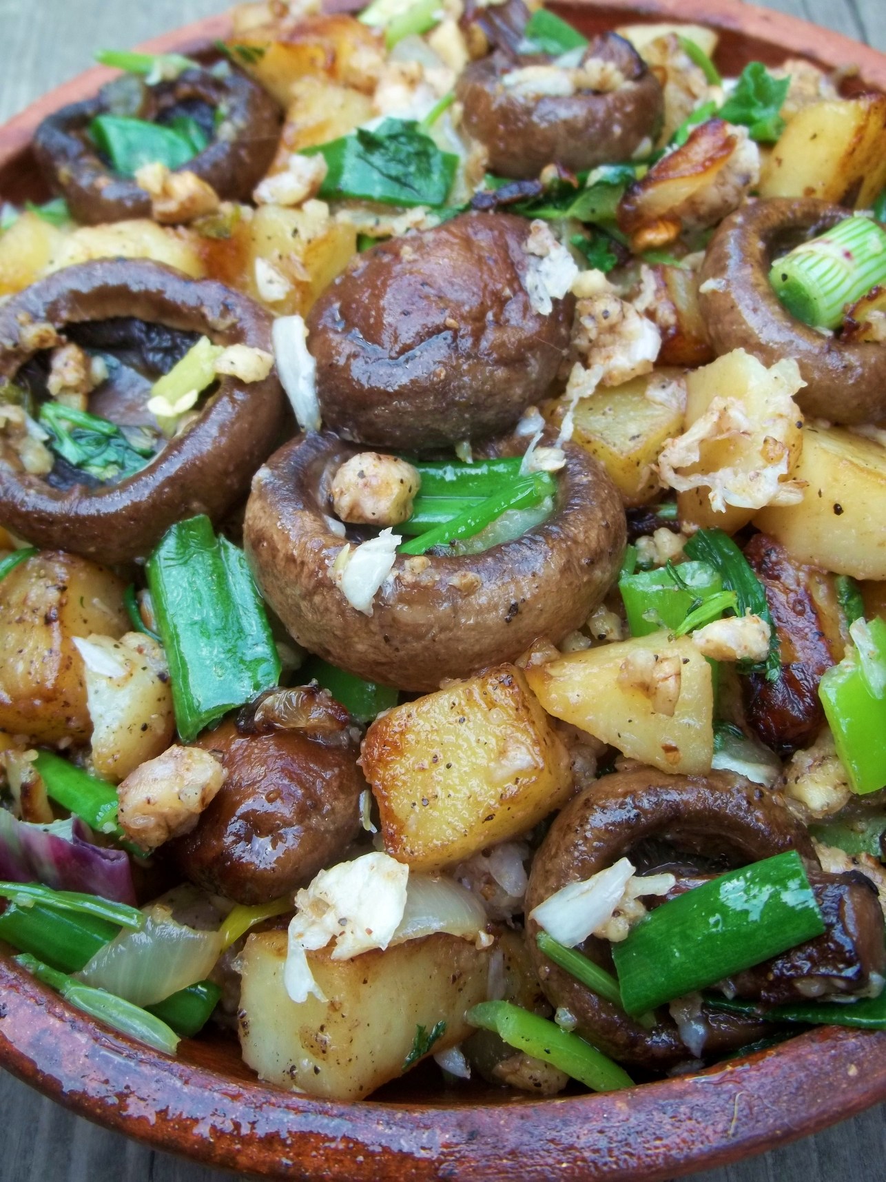 Ingredients: 500 grams of mushrooms, 200 grams of walnuts, 8-10 cloves of garlic (or less if you prefer), 500 grams of potatoes, 2 white onions, 8 green onions, 30 grams of fresh green coriander, 1 tsp of black pepper, 70 grams of butter, 10 tbs of oil, and salt (amount dependent upon personal preference.