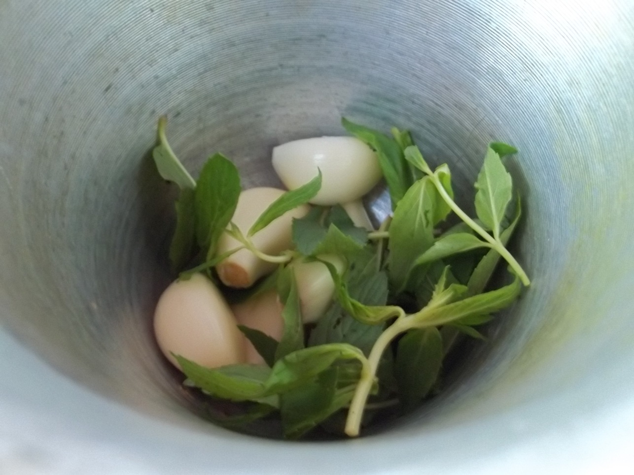 Cut the mint and add, together with the garlic cloves, to a mortar and crush together.
