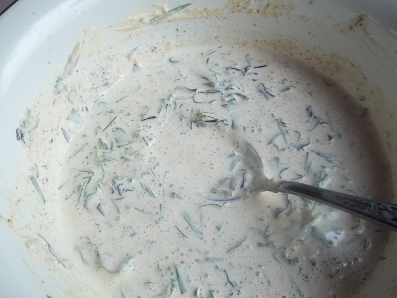 Add 100 ml of water to the mayonnaise/herb mixture to make a sauce. Stir thoroughly.