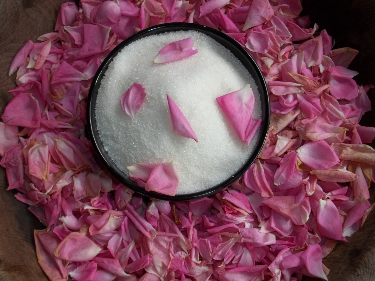 Preparation: Add the rose petals and 200 grams of sugar to a mixing bowl.