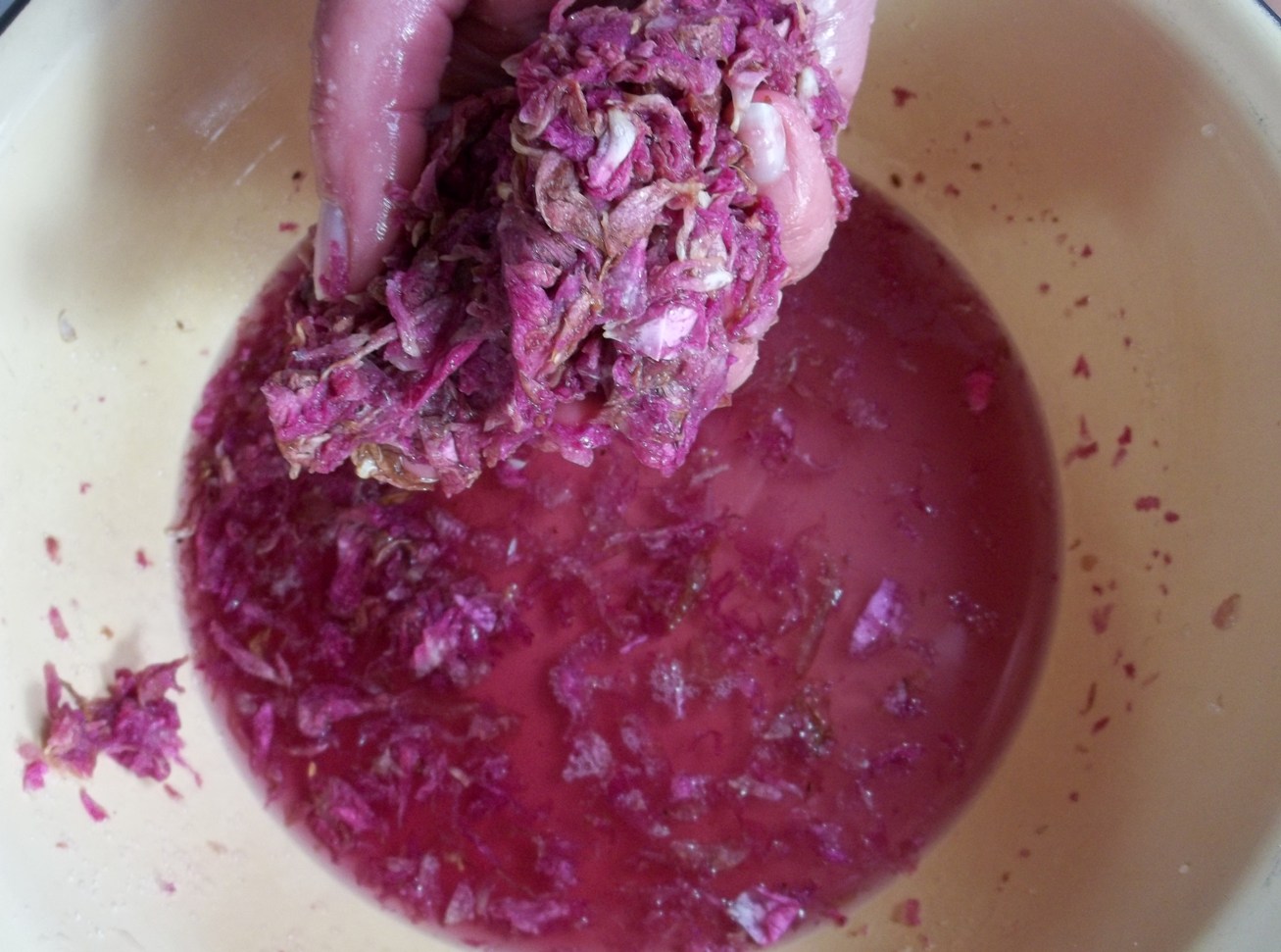 Add the rose petal ball to the sugar/water syrup. Do not discard the remaining rose petal/sugar liquid as it will be used later.