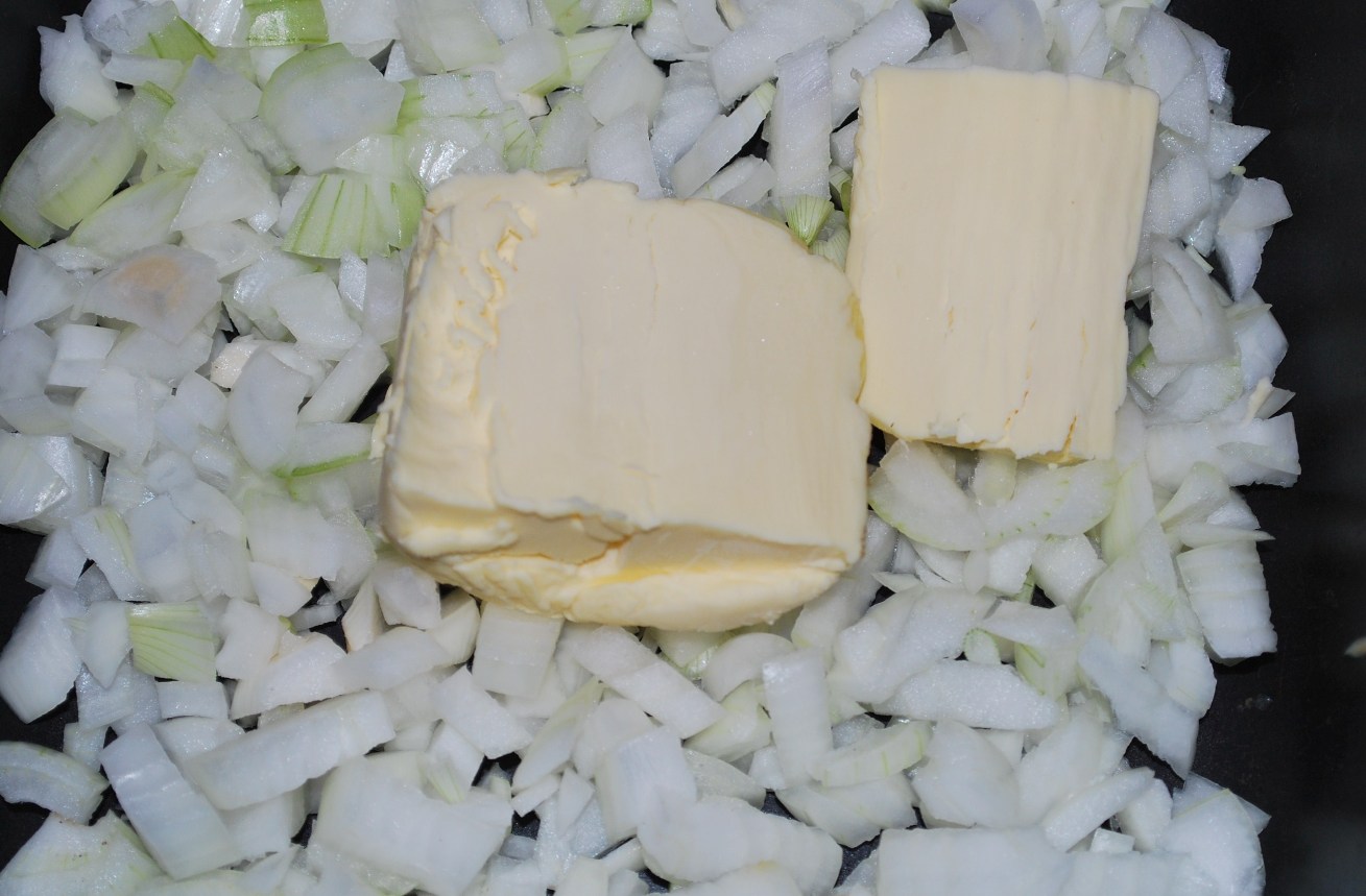 Preparation: Chop the onions and add to a pan together with 100 grams of butter and 2 tbs of oil. Fry on a low heat for 3-4 minutes, stirring frequently. Do not let the onions brown.