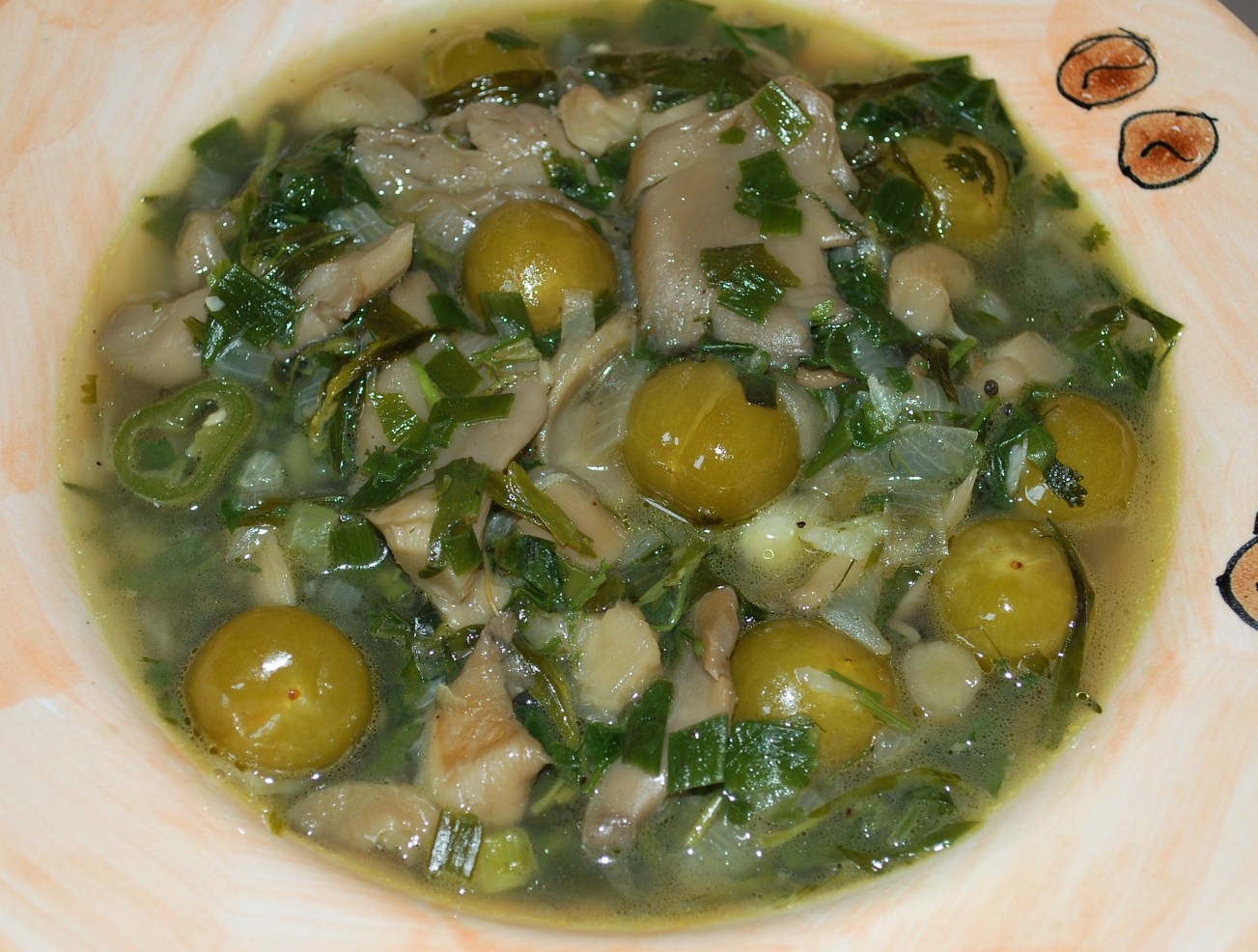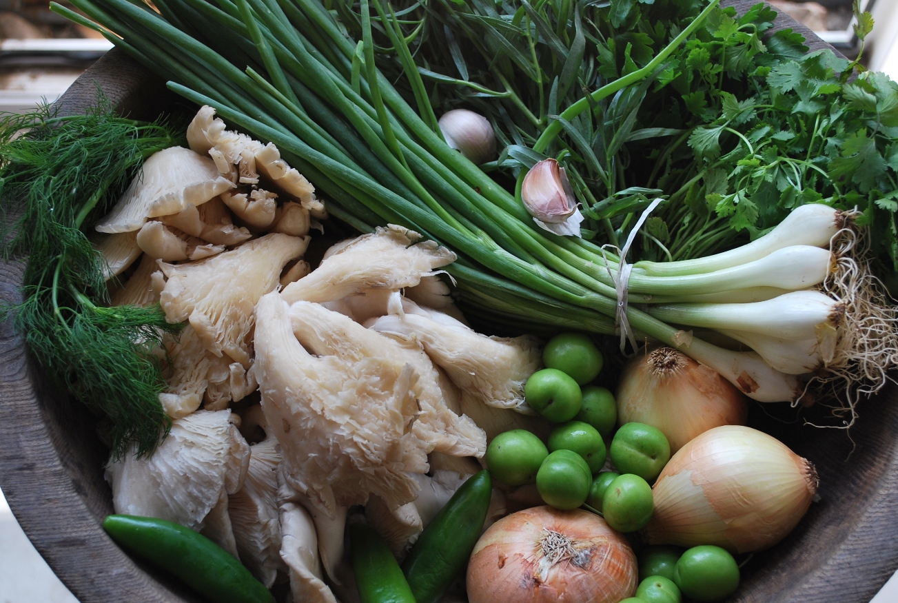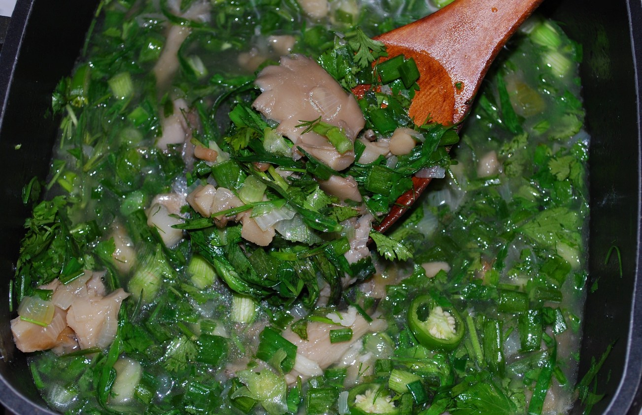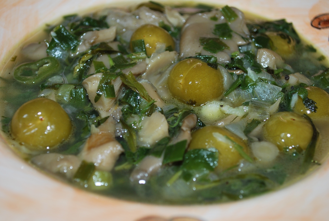 Ingredients: 1 kilo of Oyster mushrooms, 3 hot green peppers, 3 white onions, 10 green onions, 10 grams of dill, 100 grams of tarragon, 50 grams of green coriander, 1-2 cloves of garlic, 100 grams of butter, 2 tbs of oil, 300 ml of white wine, 1 liter of water, 1 level tsp of black pepper, salt (amount dependent upon personal preference), and 200 grams of wild sour plums (tkemali).