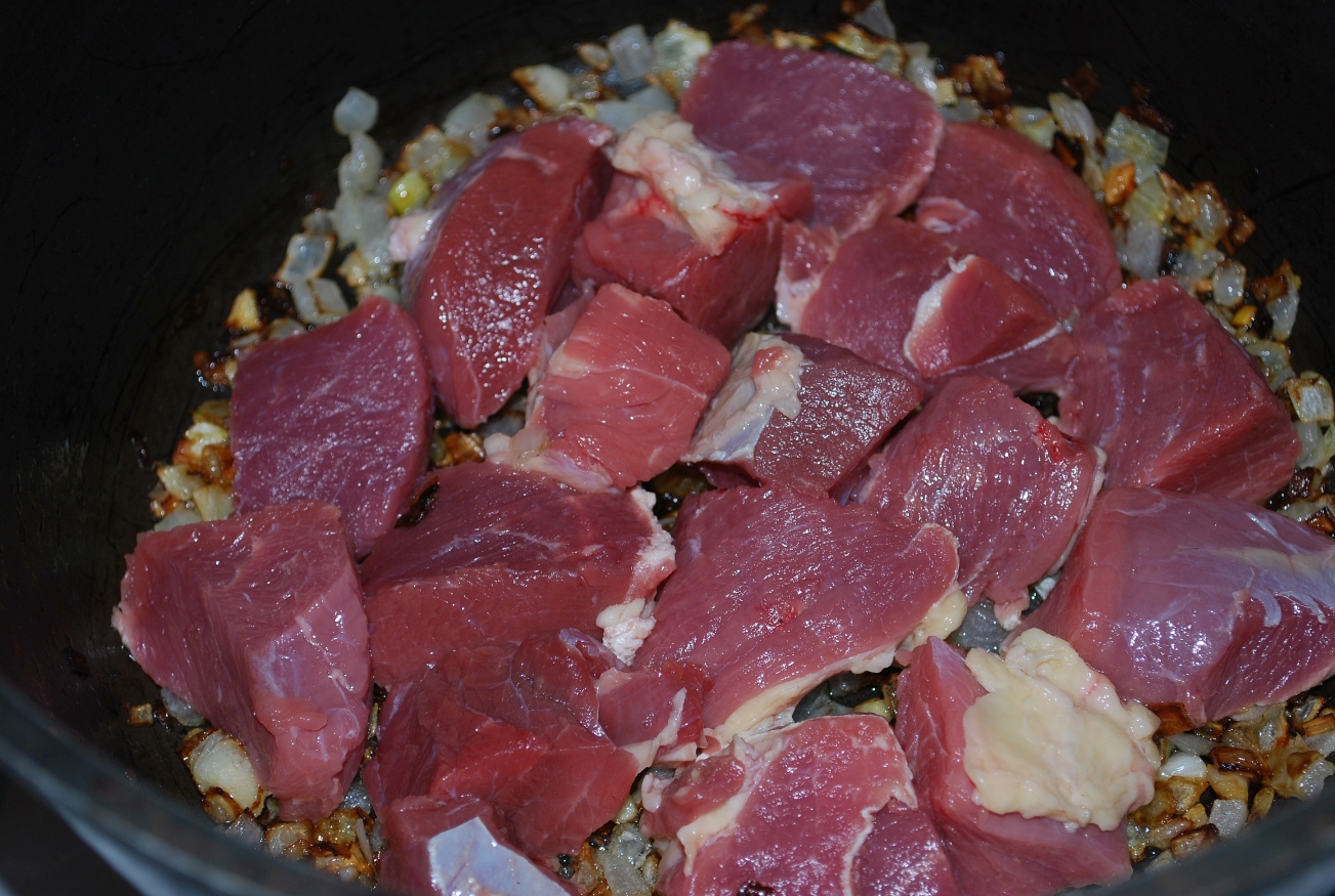 Cut the beef into small to medium chunks and add to the pan. Stir and fry (covered) for 1 hour on a low to medium heat. After 20 minutes add 100 ml of water and a further 100 ml of water after 40 minutes. Stir frequently. The liquid will reduce.