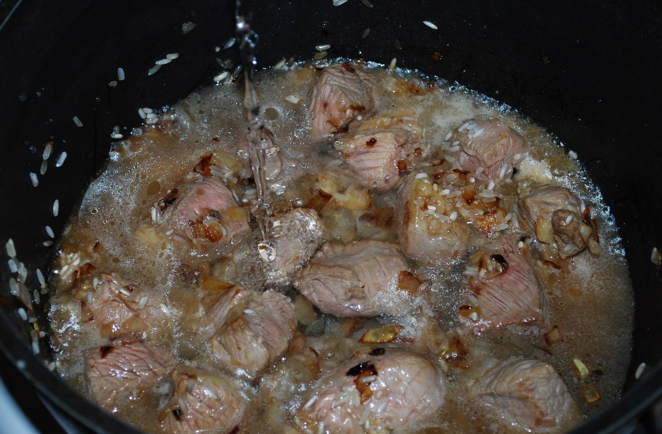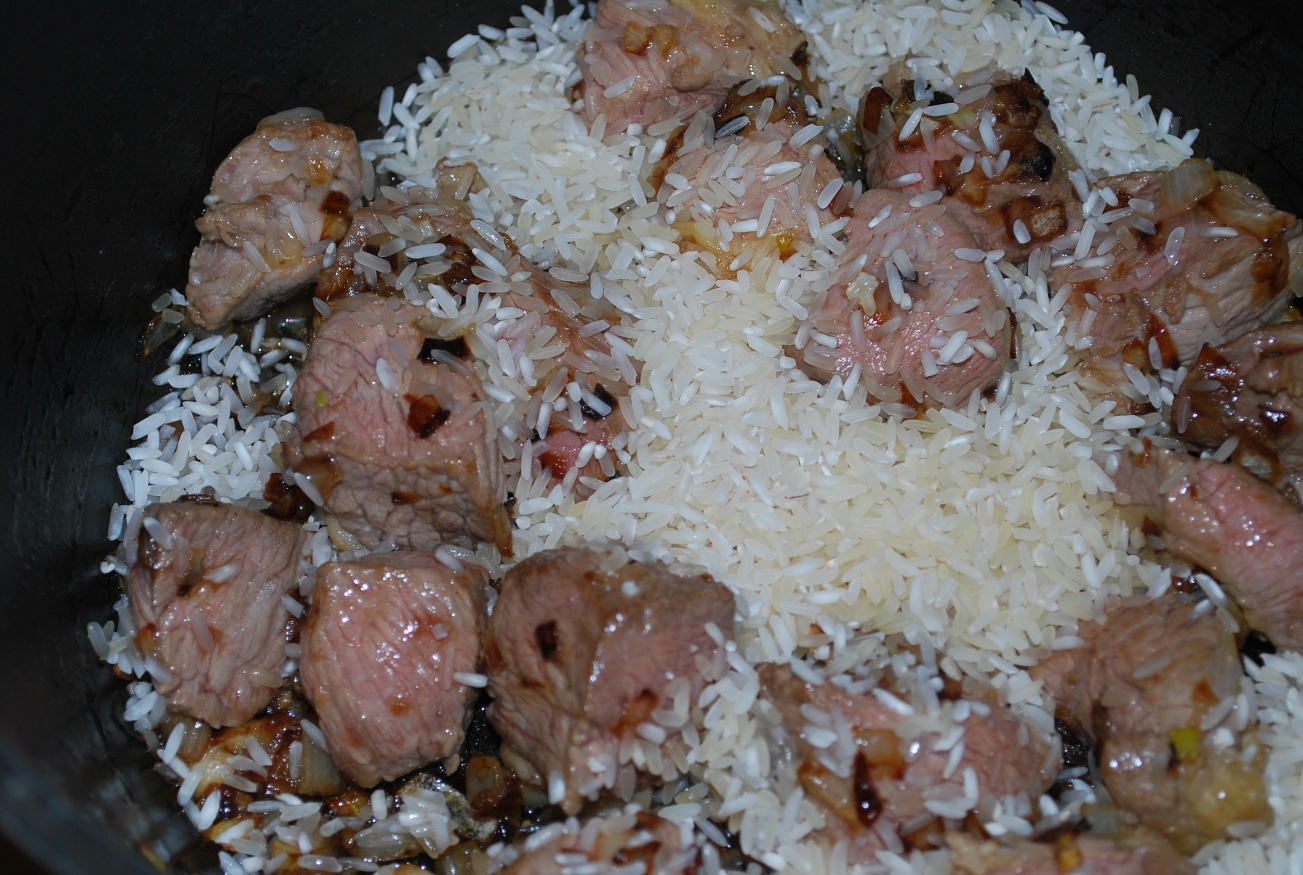 Ingredients: 700 grams of beef, 100 grams of rice, 2 large onions, 2 bay leaves, 20 grams of fresh green coriander, 1 heaped tbs of tomato puree, 2 cloves of garlic, 1 tbs of red pepper, 1.7 liters of water, 5 tbs of oil, and salt (amount dependent upon personal preference).
