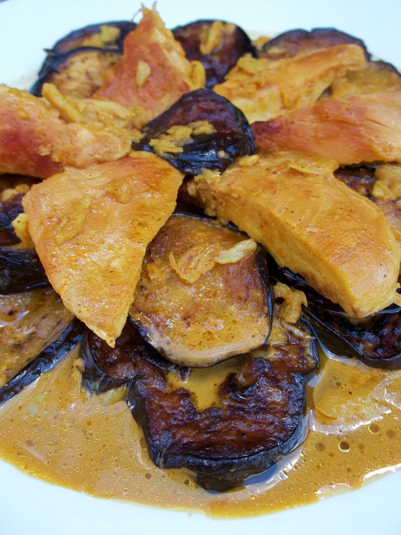 Ingredients: 400 grams of chicken breast, 400 grams of eggplant, 1 tbs of red pepper, 1 ts of blue fenugreek, 1 ts of dried marigold, 1 ts of dried coriander, 6 cloves of garlic, 1 heaped tbs of sour cream, 13 tbs of oil, and salt (amount dependent upon personal preference).