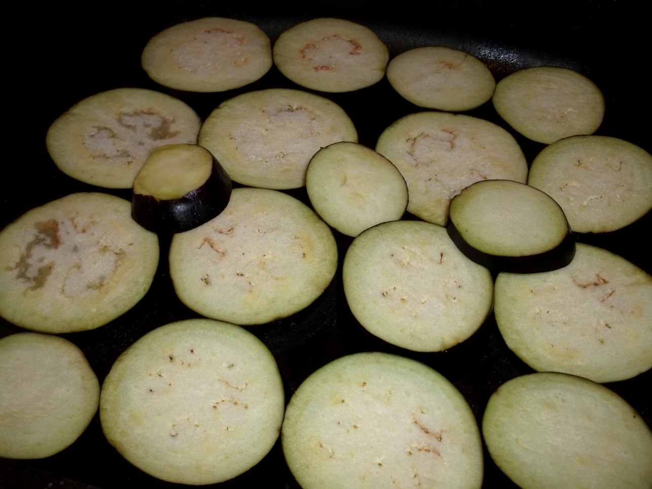 Preparation: Slice the eggplant and add to a pan with 8 tbs of oil. Fry (covered) on a low temperature until one side is cooked. Remove cover and fry the other side.