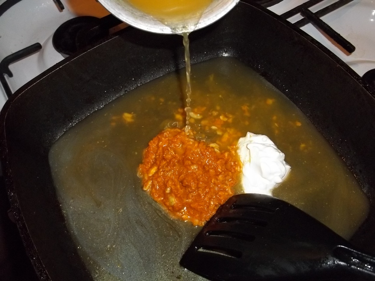 Add the crushed garlic and spices and 1 heaped tbs of sour cream to a pan. Add 200 ml of water.