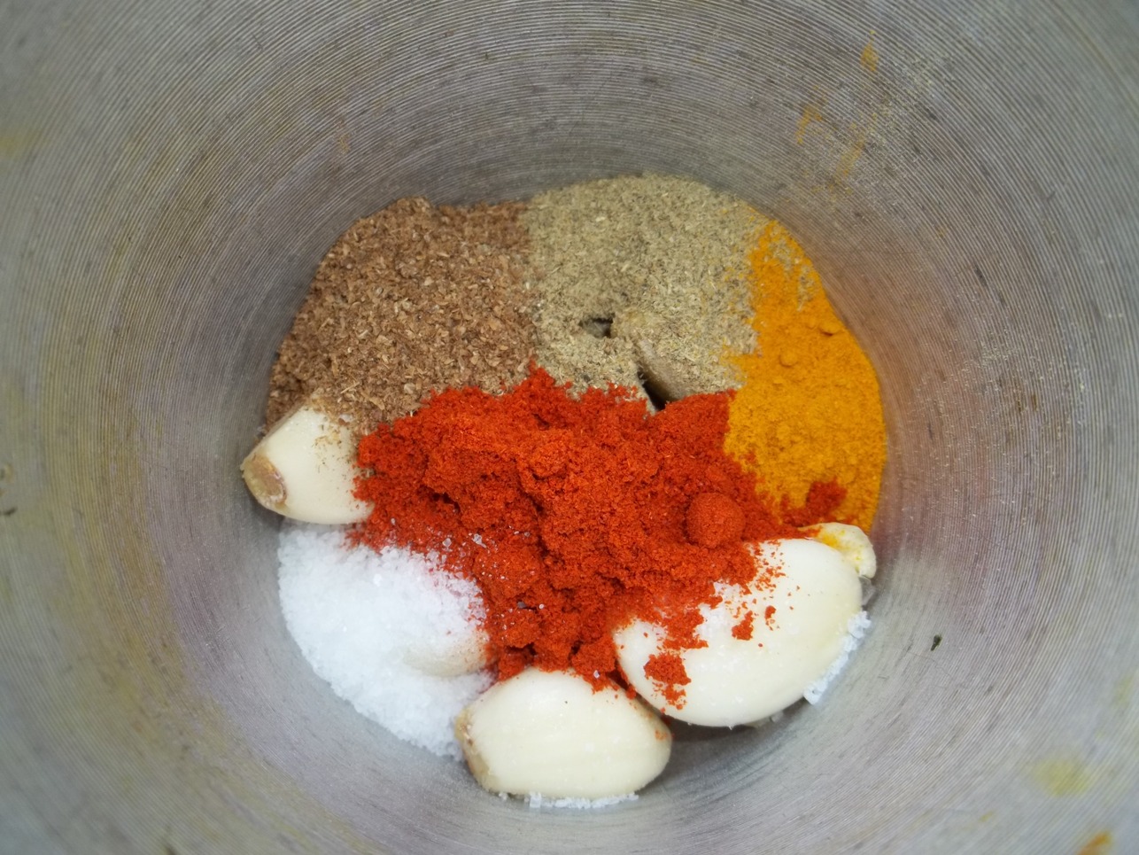 Add 1 tbs of red pepper, 1 ts of blue fenugreek, 1 ts of dried marigold, 1 ts of dried coriander, 6 cloves of garlic and salt to a mortar and crush together.