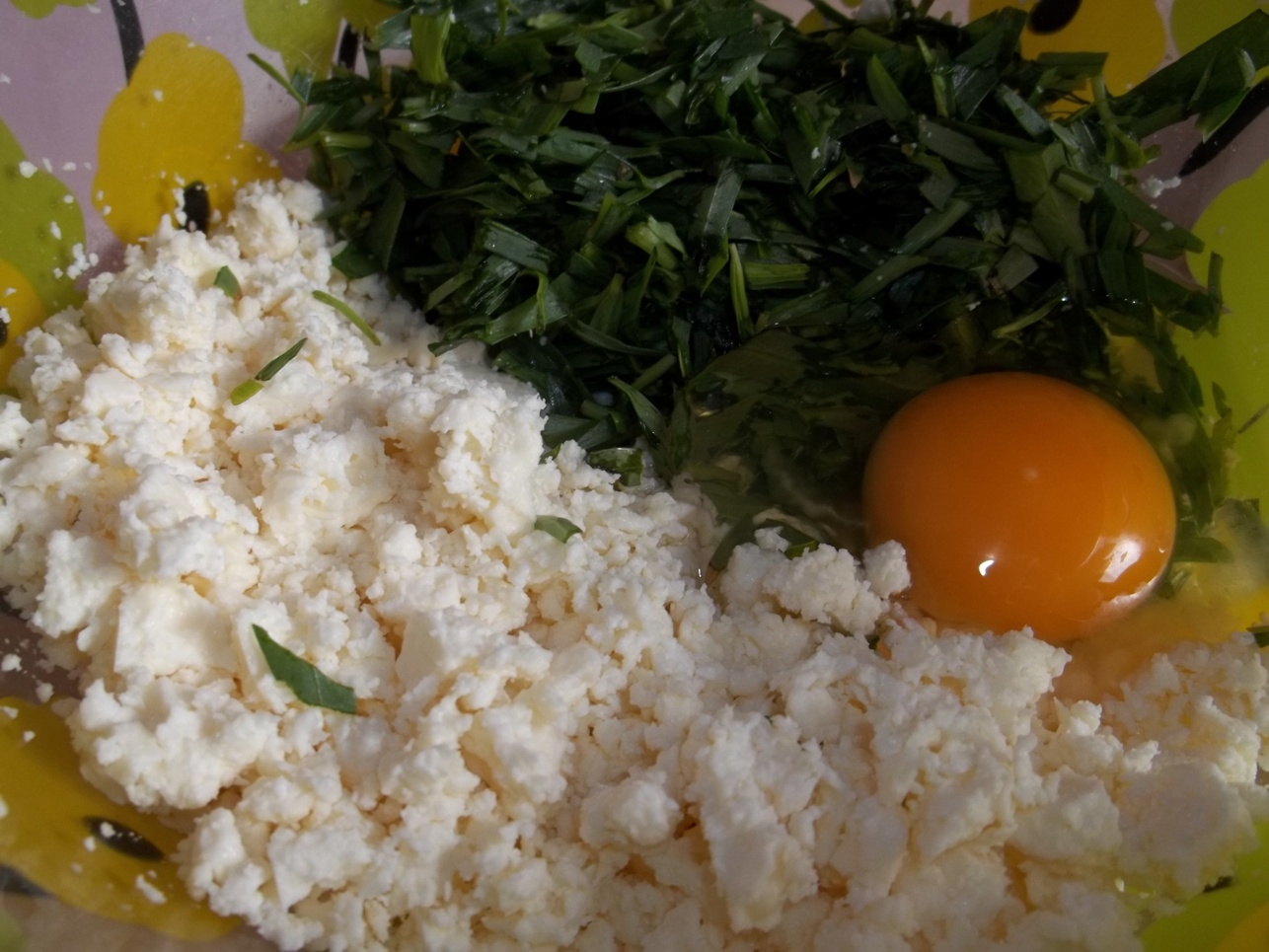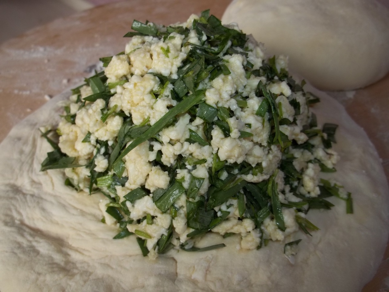 Ingredients for the filling: 800 grams of Imeretian cheese (not too salty) (mozzarella can be substituted for Imeretian cheese), 200 grams of tarragon, 1 egg, and 50 grams of butter.