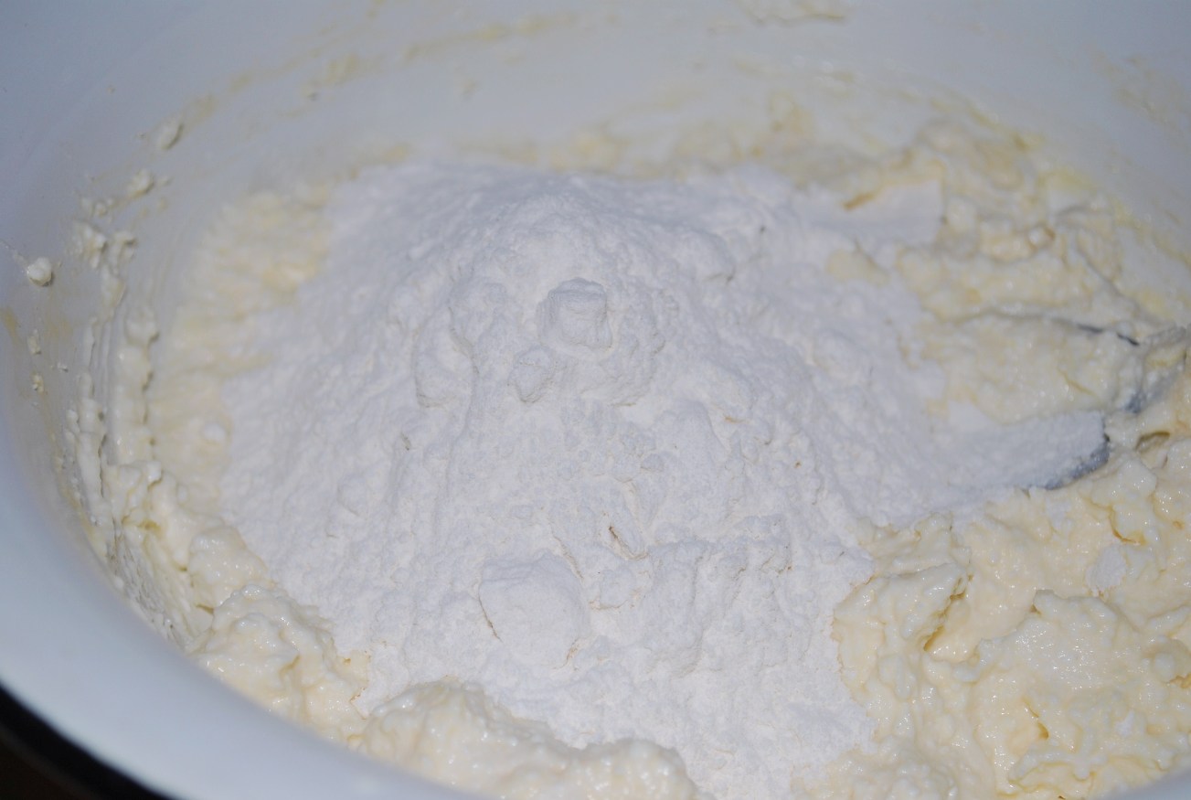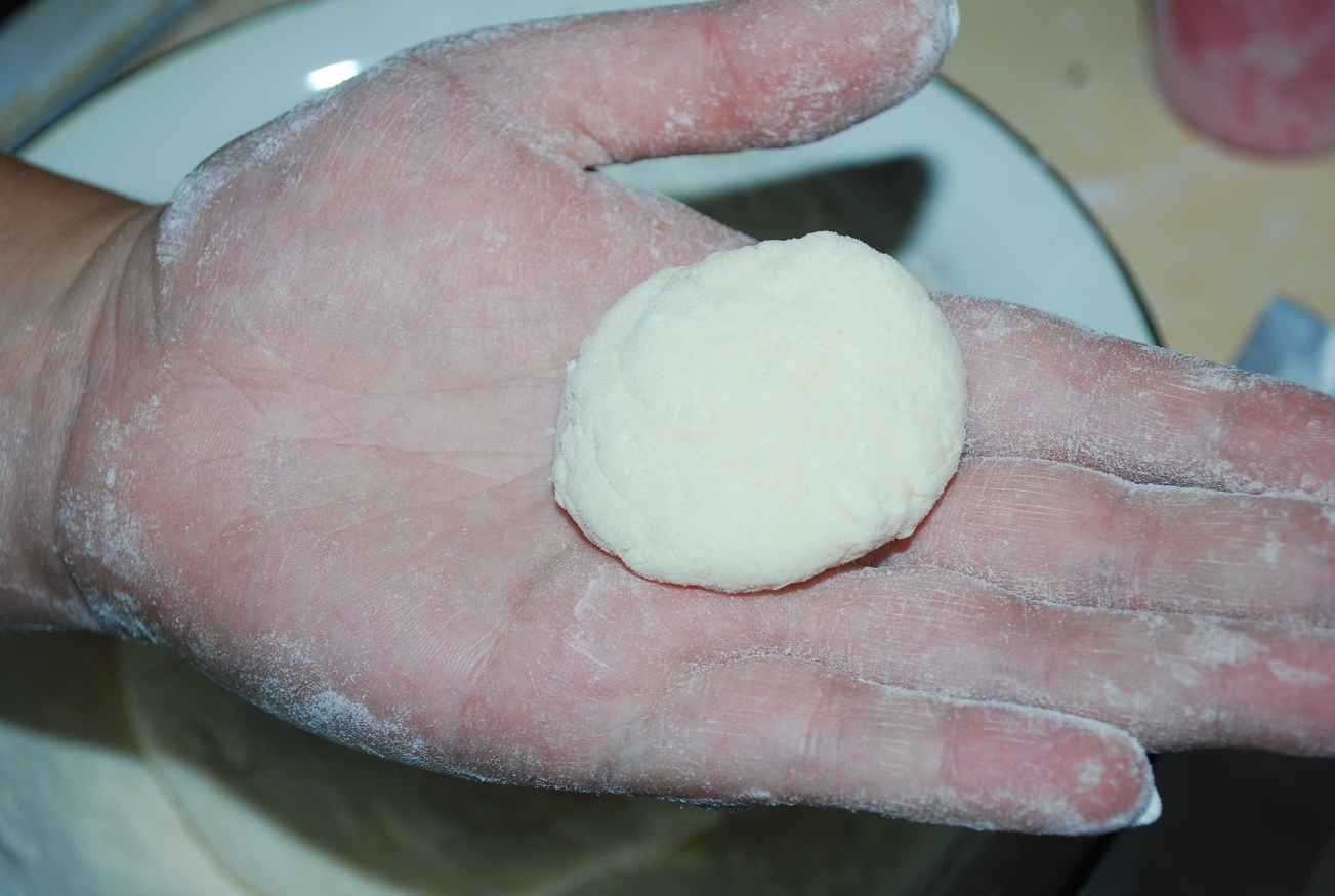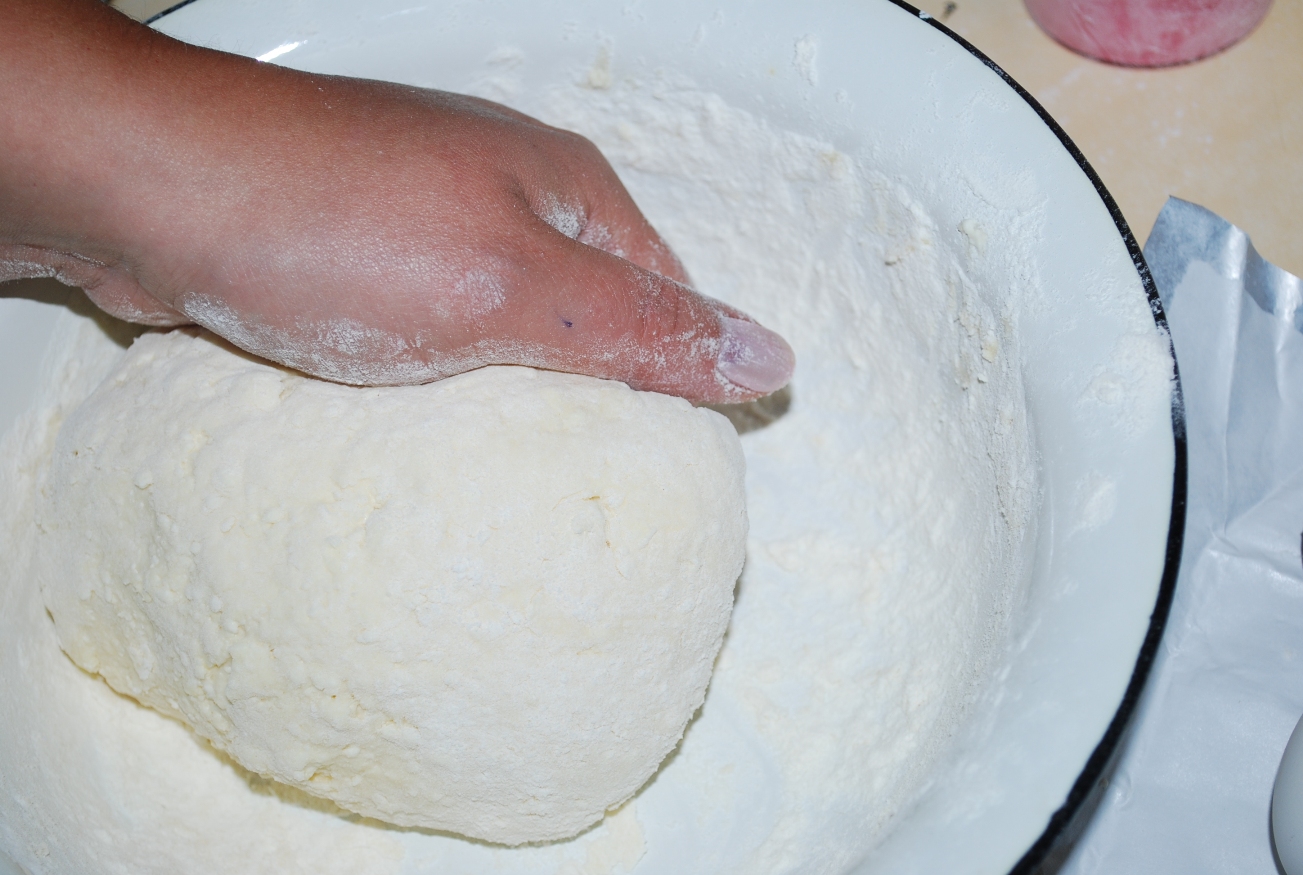 Ingredients: 200 grams of cottage cheese, 1 egg, 50 grams of butter, 100 grams of Imertian cheese (or mozzarella), 230 grams of flour (for the dough and for dusting preparation areas), 1 heaped tbs of sour cream and, salt (amount dependent upon personal preference).