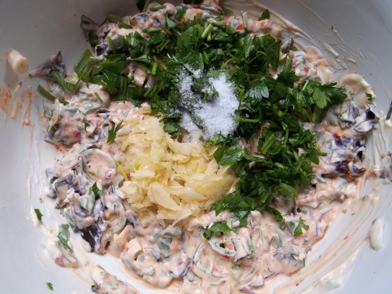 Slice the peppers and finely chop the green onions, coriander, purple basil and add to a mixing bowl together with 100 grams of mayonnaise and 1 heaped tsp of ajika. Mix and squash with a wooden spoon. Leave for 15-20 minutes.