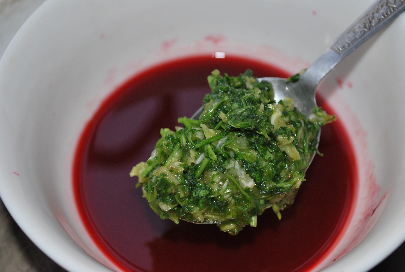 Sieve the mashed blackberries and then add the crushed garlic/coriander/dried dill and salt mixture.