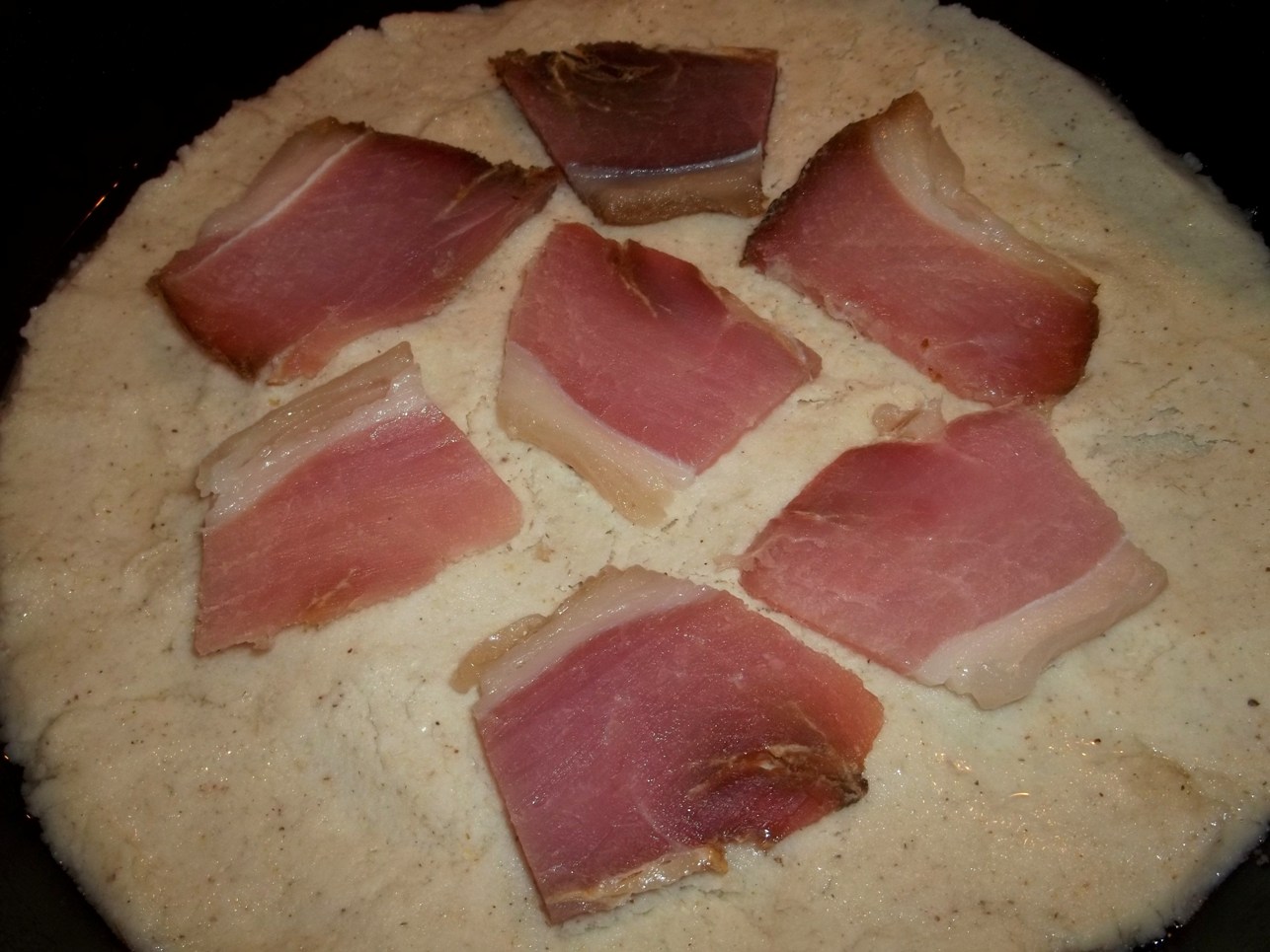 Break off parts of the remaining cornmeal and use your hands and fingers to press and flatten each piece over the bacon and cornmeal base until it is completely covered. NOTE: Because of the consistency of the cornmeal it is not possible to roll it out to make the cover so it must be done piece by piece.