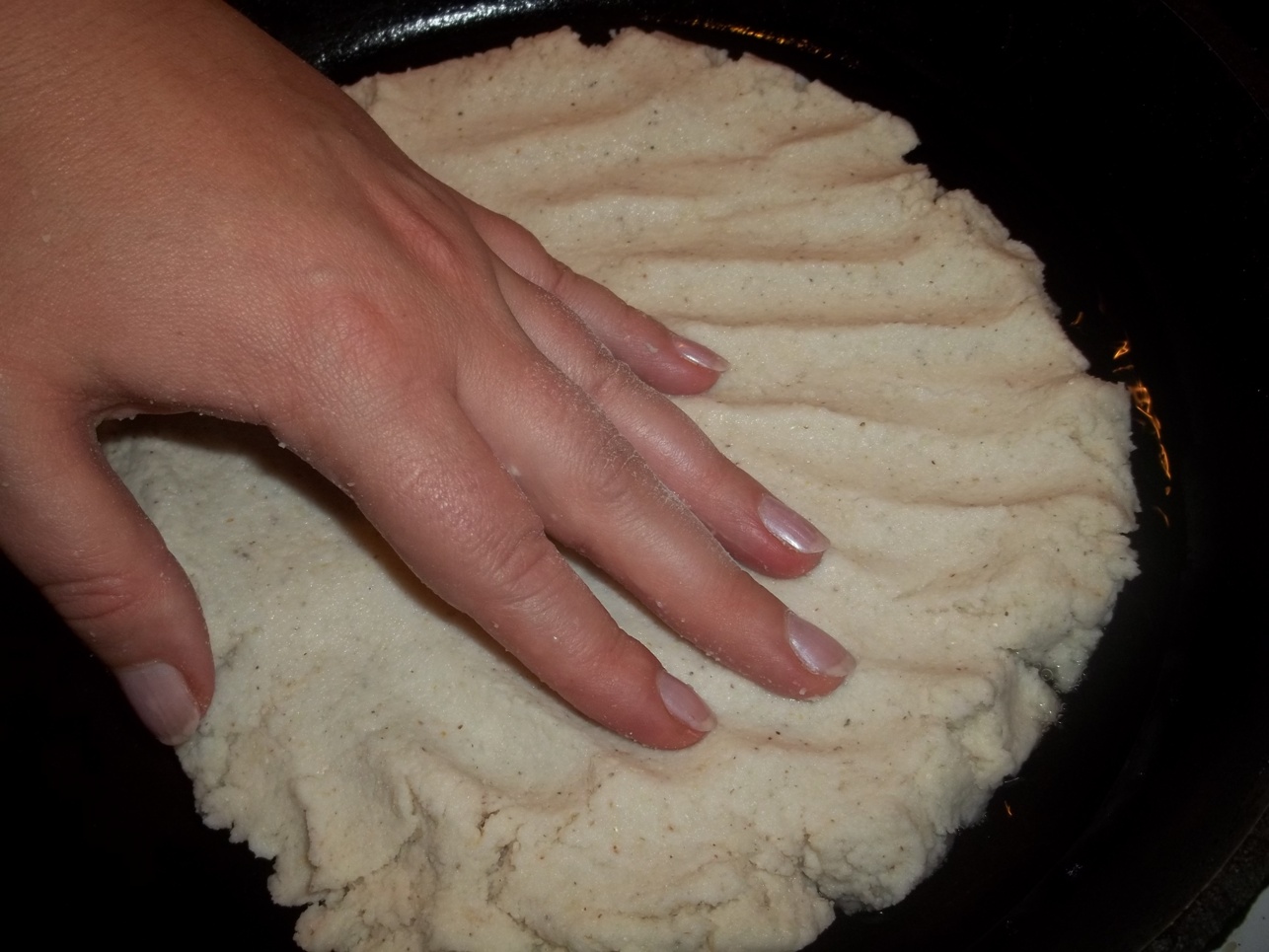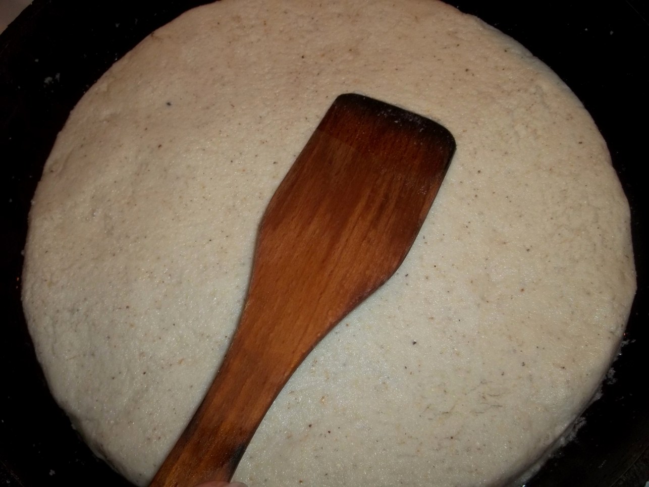 Use a wooden spatula wiped with some of the melted pork belly fat to smooth the surface of the cornmeal.