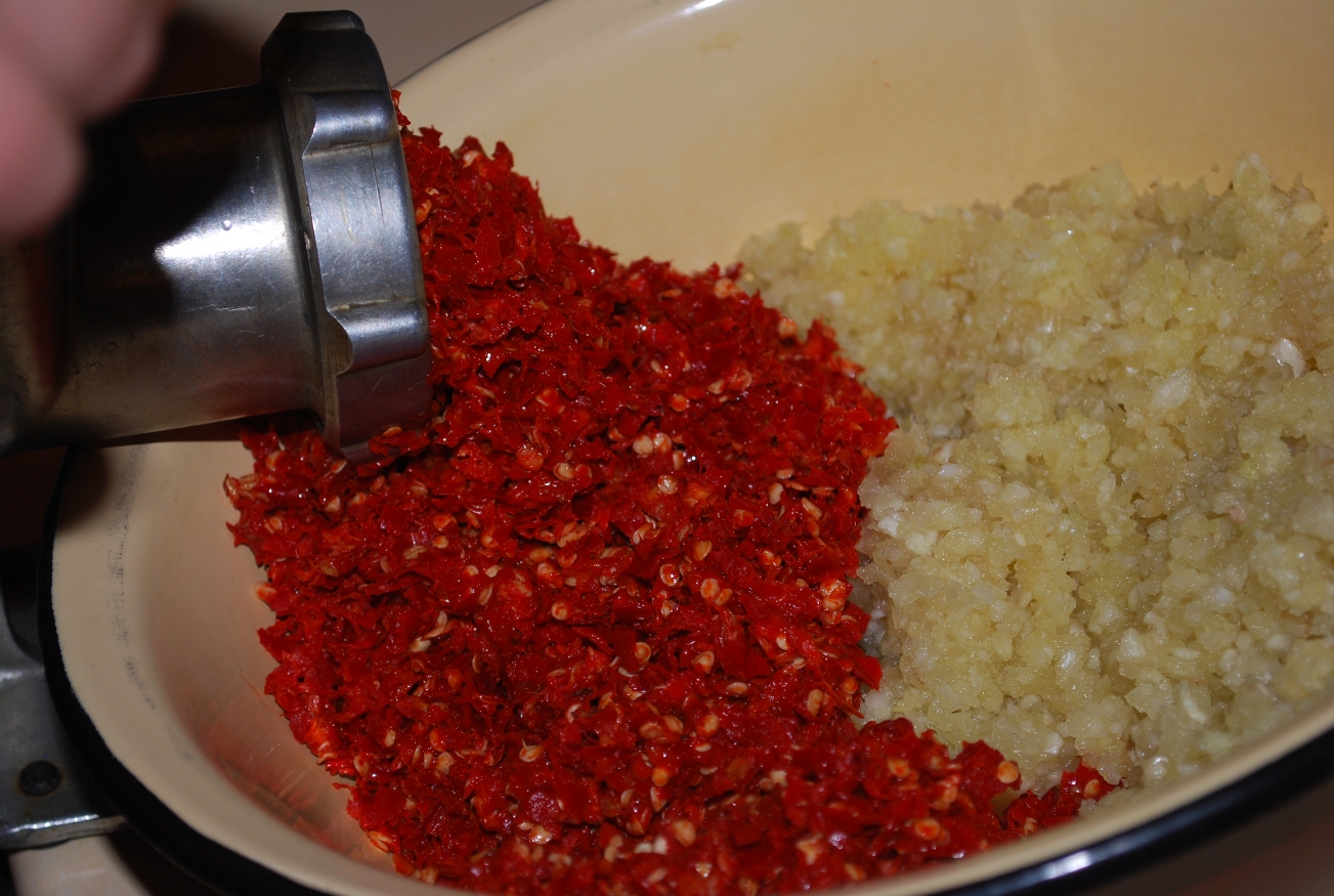Remove the skins from the garlic. Put one-third of the garlic to one side and grind the remaining two-thirds. Grind the remaining half of the hot red peppers.
