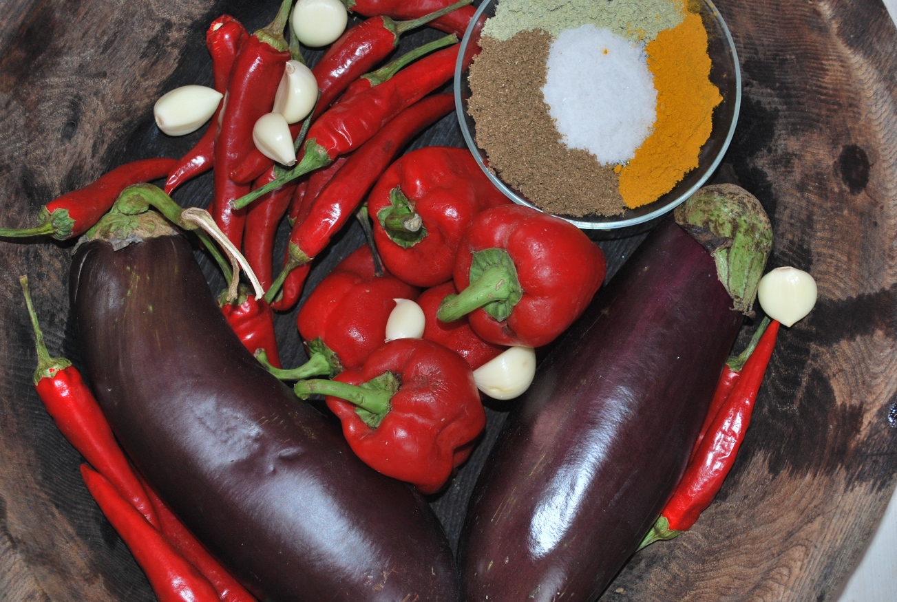 Ingredients: 10 kilos of eggplant, 1.5 kilos of hot red peppers, 1.5 kilos of sweet red peppers, 600 grams of garlic (without skins), 1.3 liters of oil (to fry the eggplant), 1 liter of white wine vinegar, 180 grams of salt, 3 heaped tbs of dried coriander, 2 heaped tbs of blue fenugreek, and 1 level tbs of dried marigold.