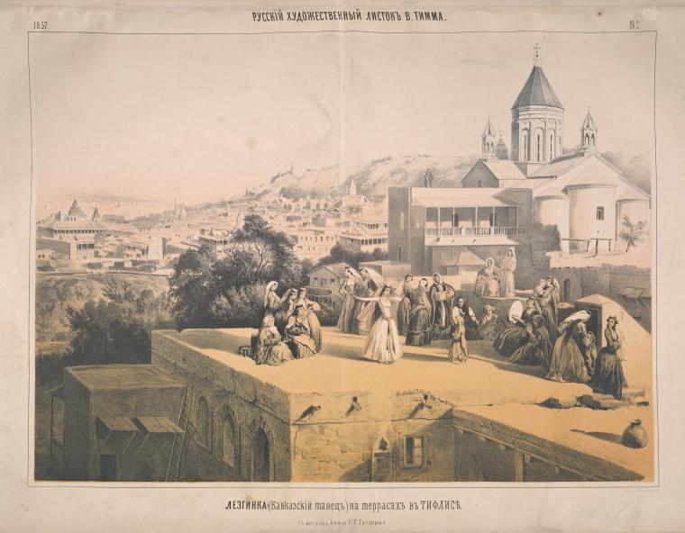 Lithograph by Vasily Timm of a Grigory Gagarin painting of Prince Alexander Chavchavadze’s three daughters dancing.