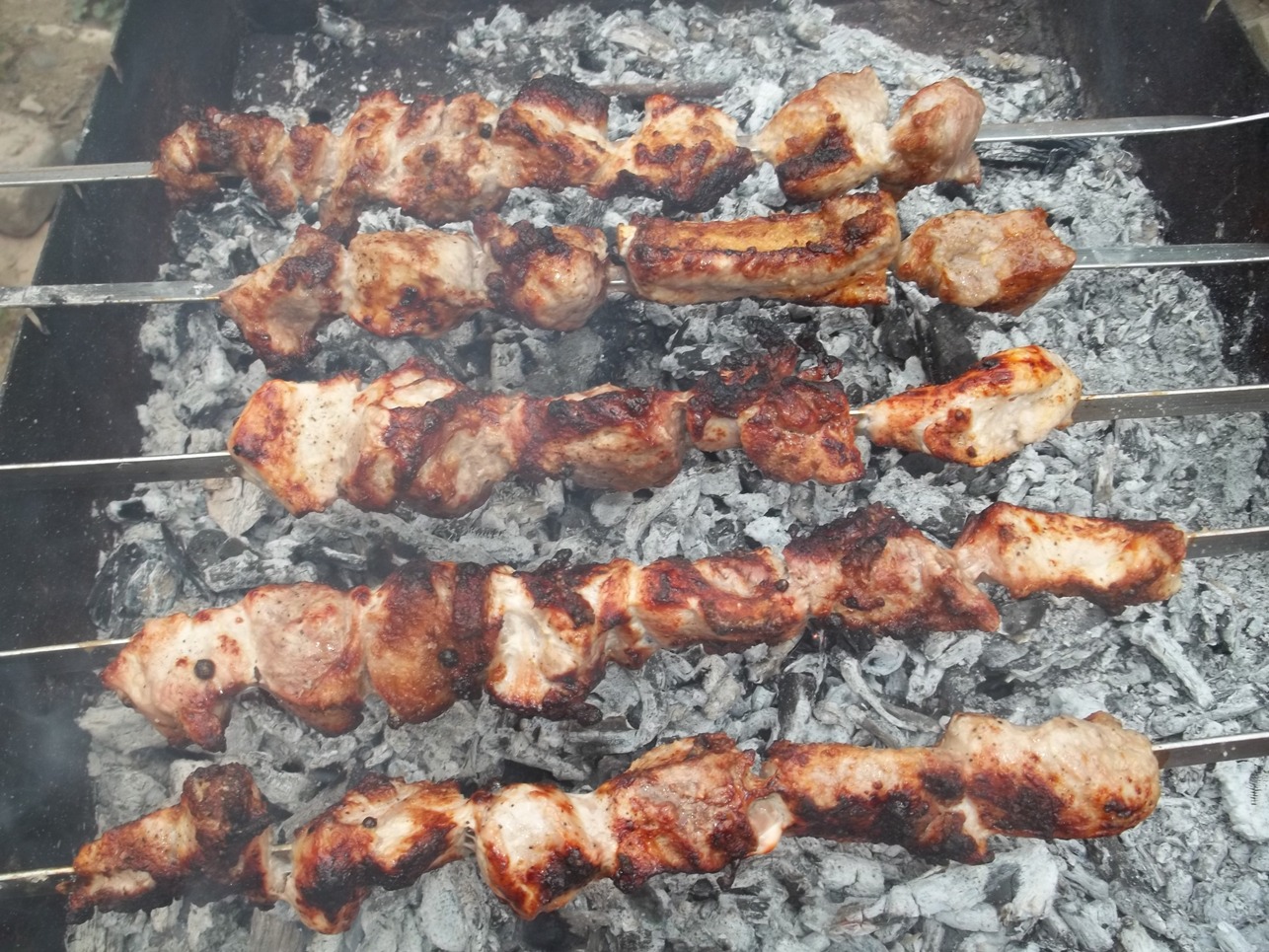 When ready to barbecue, remove the marinated pork from the refrigerator and thread the individual pieces onto skewers (Georgian: შამფური). Sprinkle the meat on all sides with coarse salt.