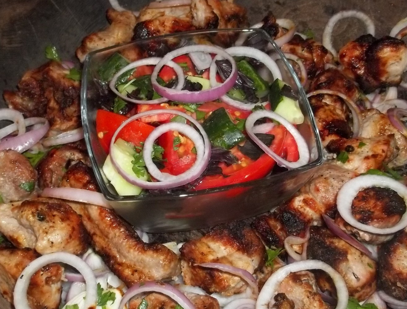 A salad is usually eaten with the barbecued meat. Click here to see our recipes for Georgian salads.