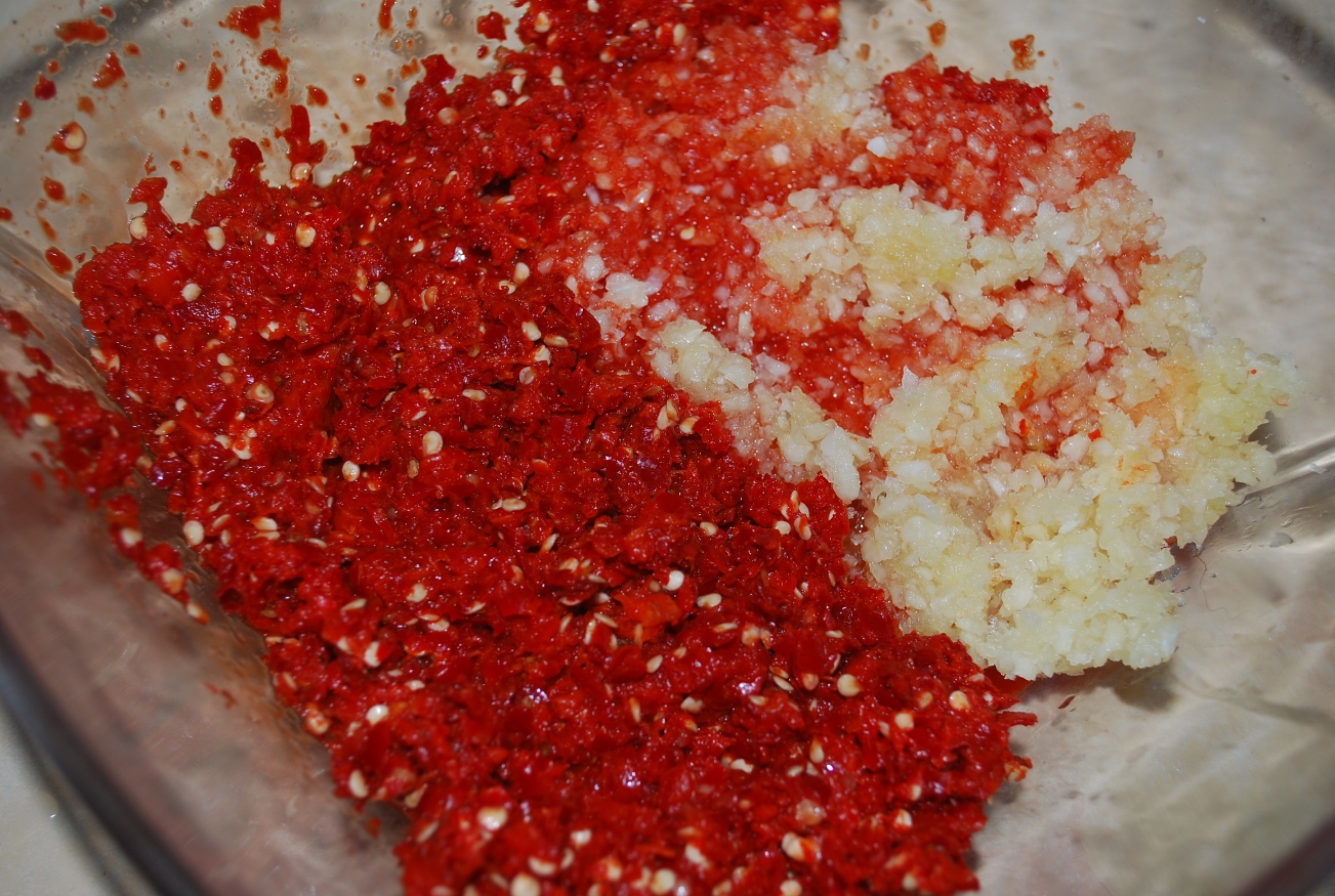 Grind the peppers and garlic. We used a meat grinder.
