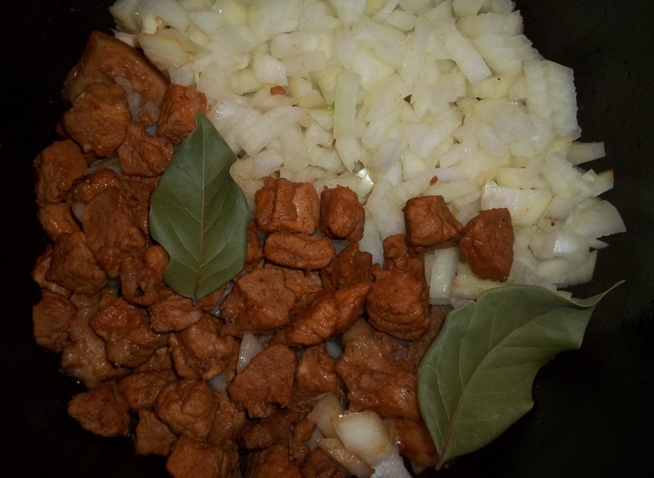 Chop and add the onions, together with the bay leaves. Add 5 tbs of oil (not necessary if you have used fatty pork). Stir. Partly cover and cook on a medium temperature for 5-7 minutes, stirring frequently. Do not let the onions brown.