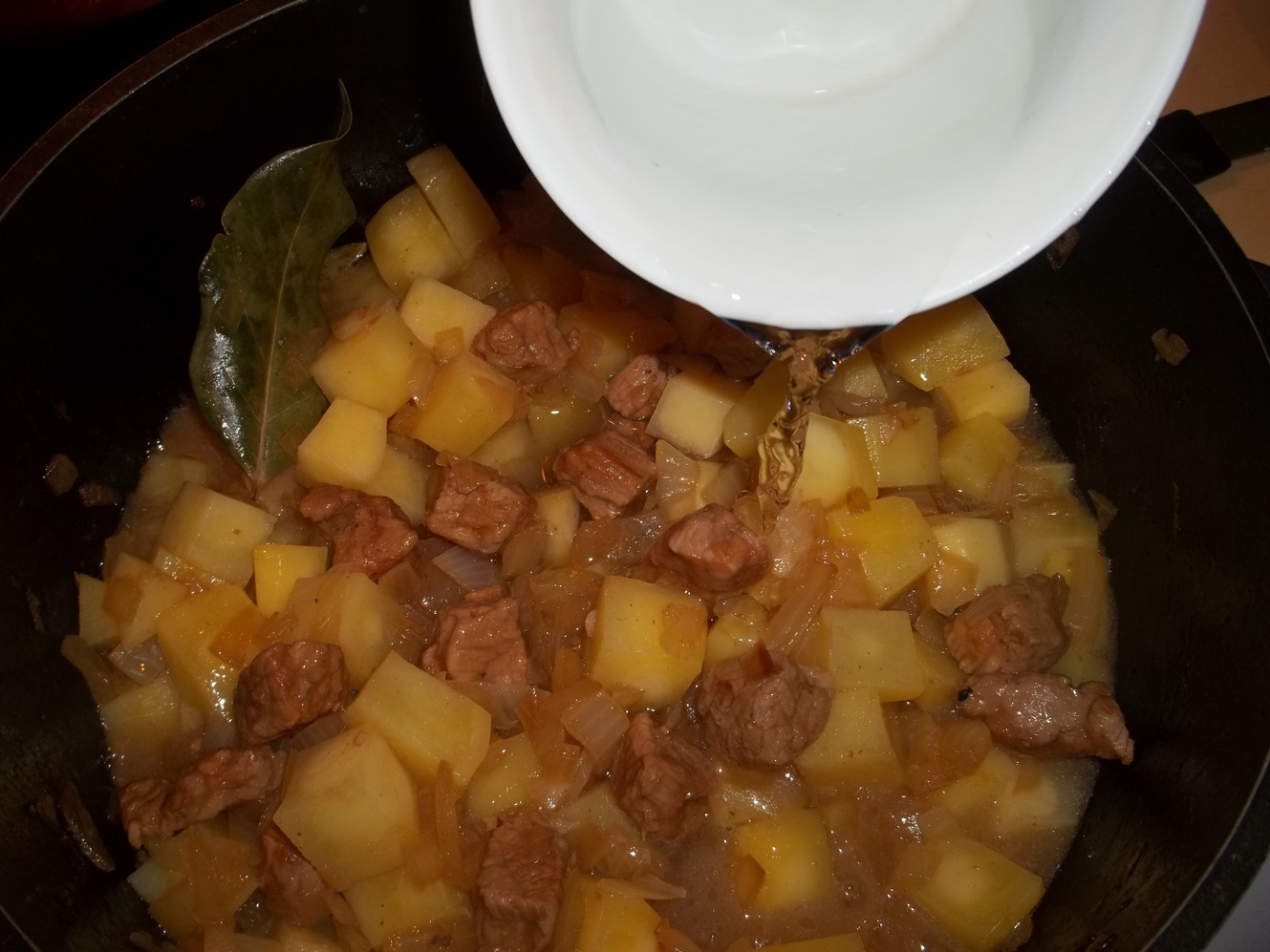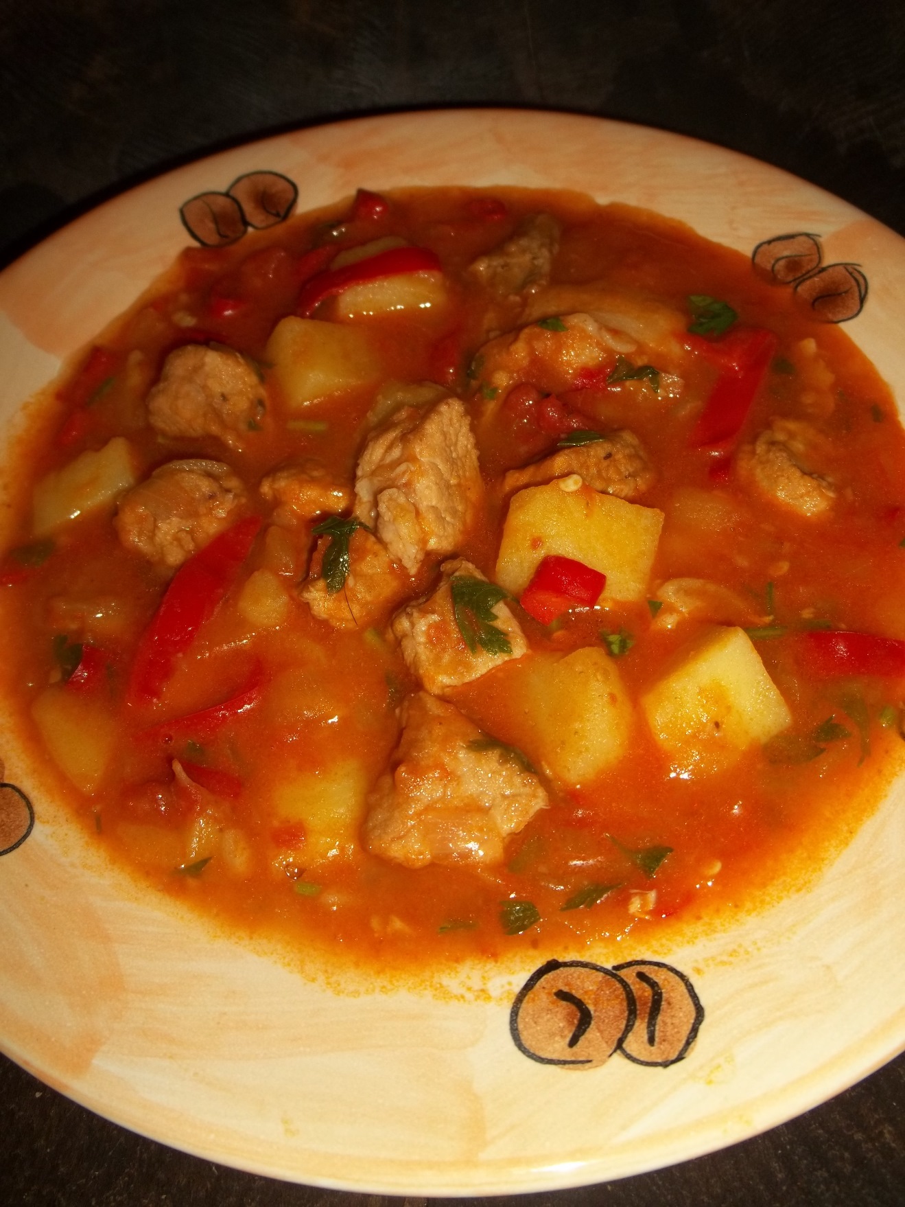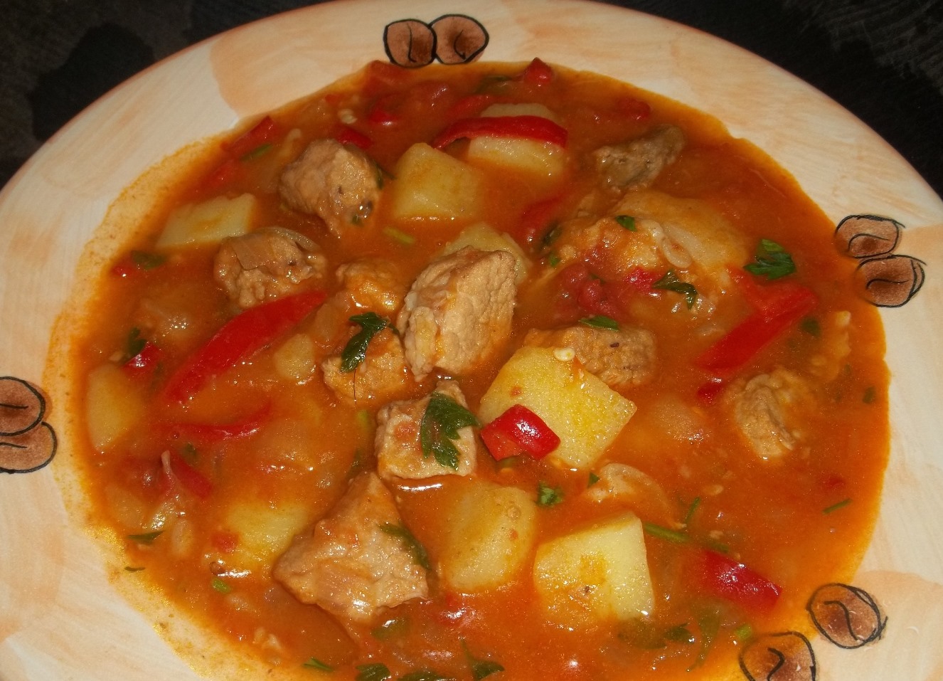Ingredients (8-10 servings): 1 kilo of pork, 1 kilo of potatoes, 3 large onions, 5 medium to large juicy tomatoes, 4-5 cloves of garlic, 3 sweet red peppers, 3 hot red peppers, 2 bay leaves, 10 grams of fresh parsley, 1 tsp of dried coriander, 5 tbs of oil (if meat is not fatty), and salt (amount dependent upon personal preference).