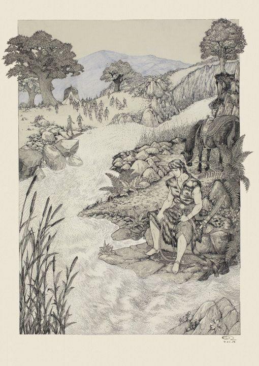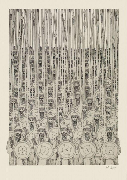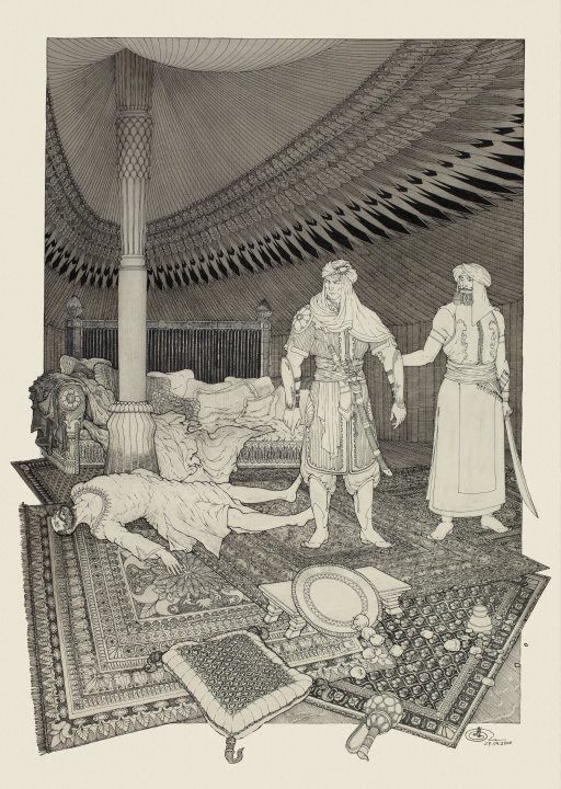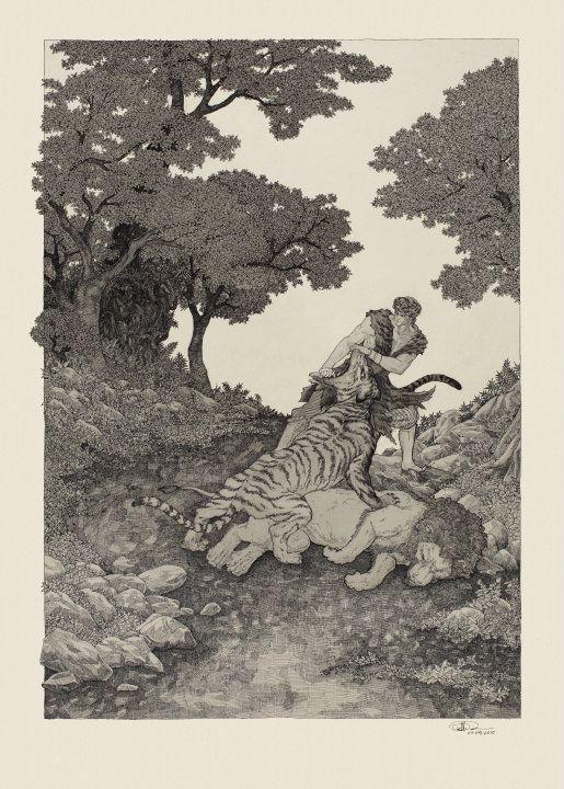 Illustrations for an edition of the Georgian epic poem “The Knight in the Panther’s Skin” (Georgian: ვეფხისტყაოსანი), drawn by Georgian artist Datto Machavariani and published by Bakur Sulakauri Publishing House in 2011.