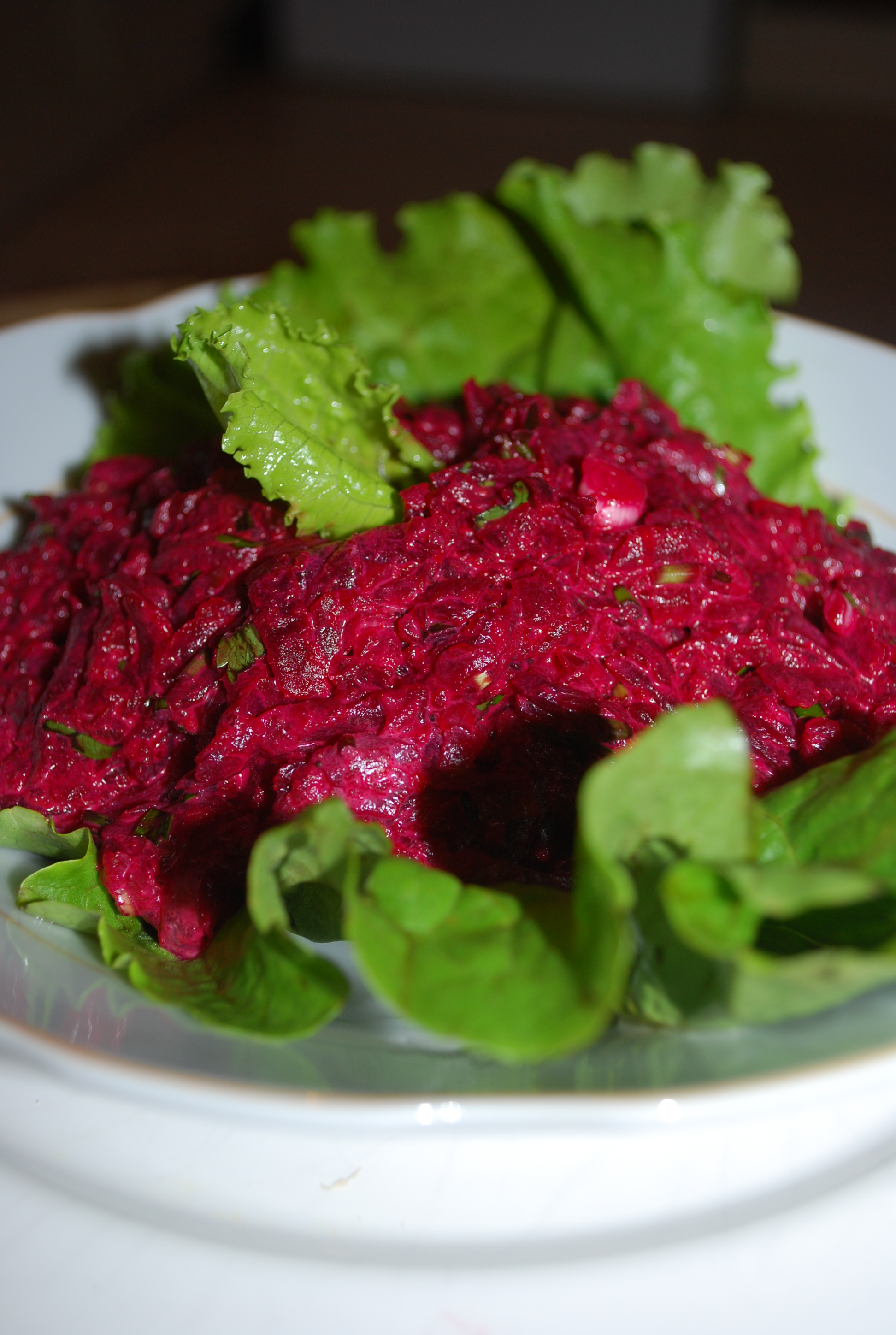 Ingredients: 1 kilo of beetroot, 100 grams of mayonnaise, 80 grams of parsley, 120 grams of green onion, 50 ml of tomato sauce (use our recipe or 1 tbs of tomato puree and 1 clove of garlic), 1 level tsp of red pepper (optional), 1 level tsp of dried coriander, two thirds tsp of blue fenugreek, two third tsp of black pepper, and salt (amount dependent upon personal preference).