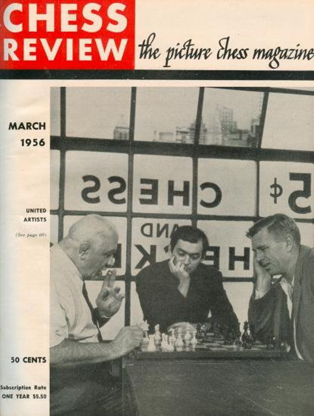 Kola Kwariani playing chess with the actor Sterling Hayden, watched by the film director Stanley Kubrick.