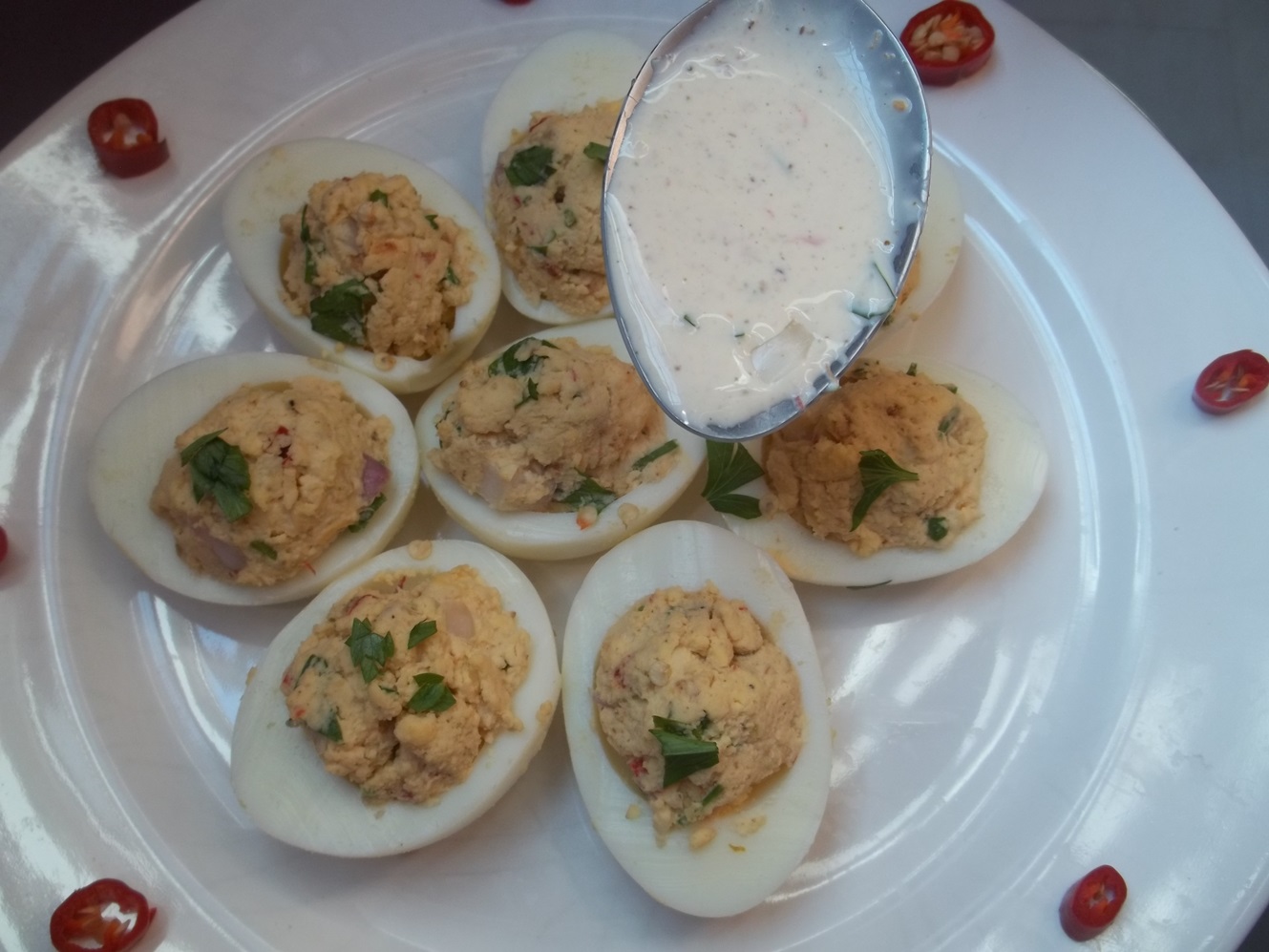 Stuff the egg halves with the filling and use a spoon to pour the mayonnaise sauce over the eggs.