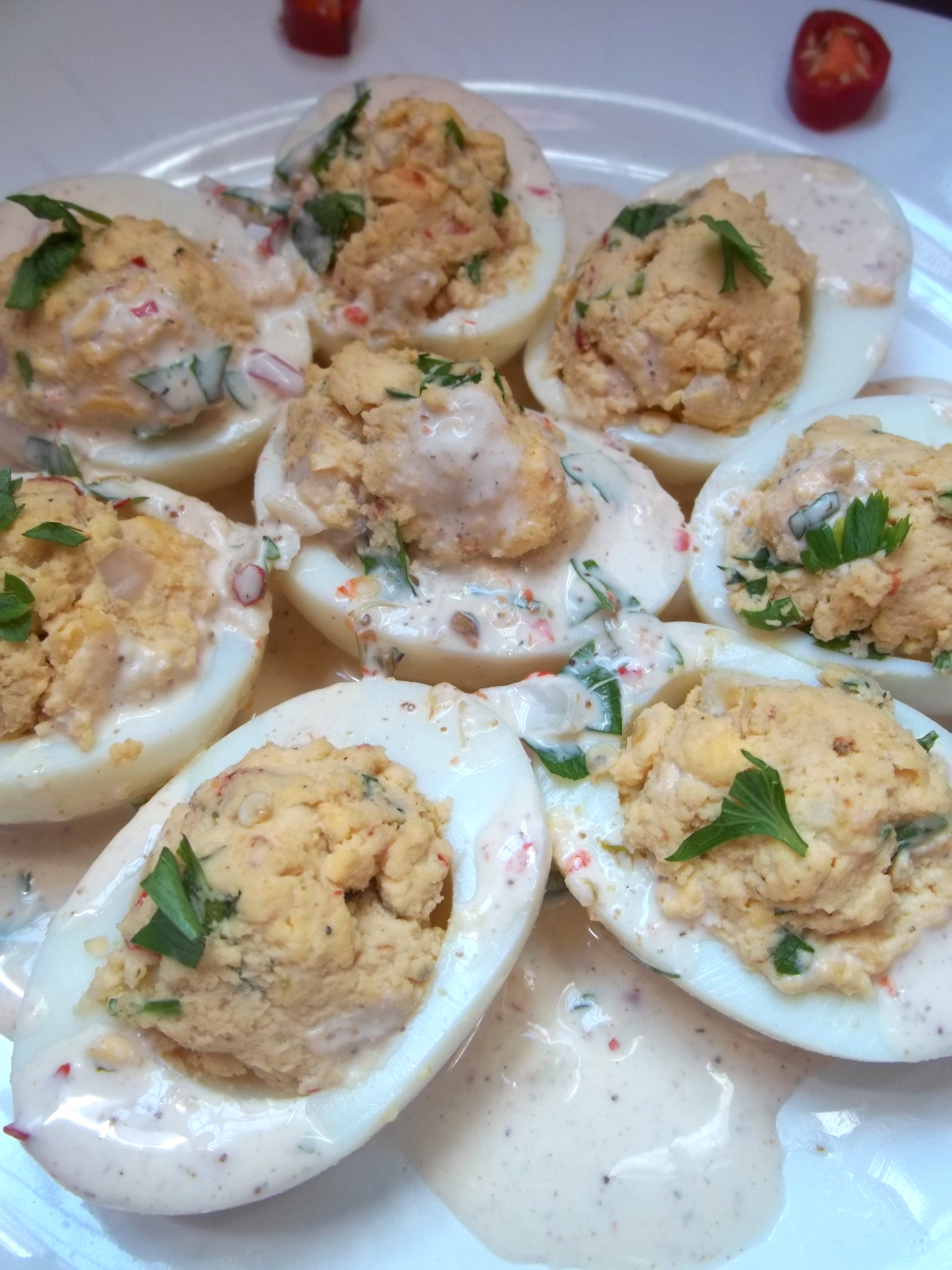 For the egg filling: 10 grams of parsley, 1 heaped tbs of mayonnaise, 1 small red onion, 1 tsp of ajika, 2-3 cloves of garlic, half tsp of dried coriander, and salt (amount dependent upon personal preference).